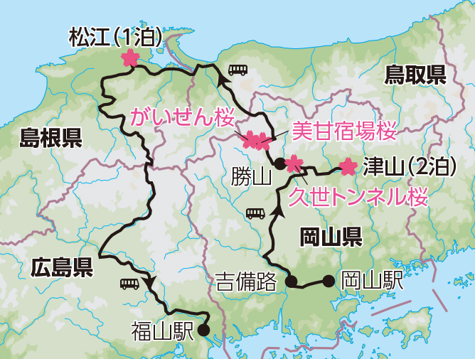 津山09:30発 久世トンネル桜 勝山宿 美甘宿場桜 新庄がいせん桜 松江17:00着