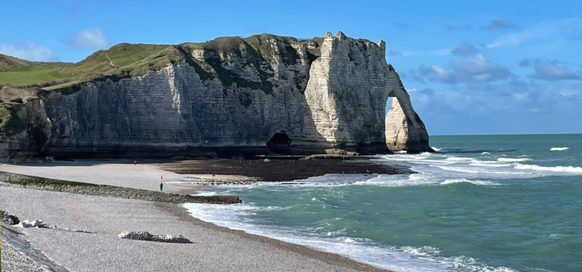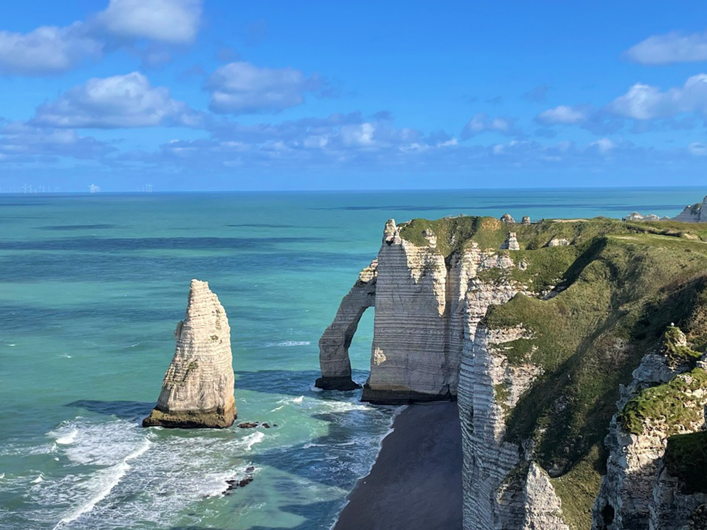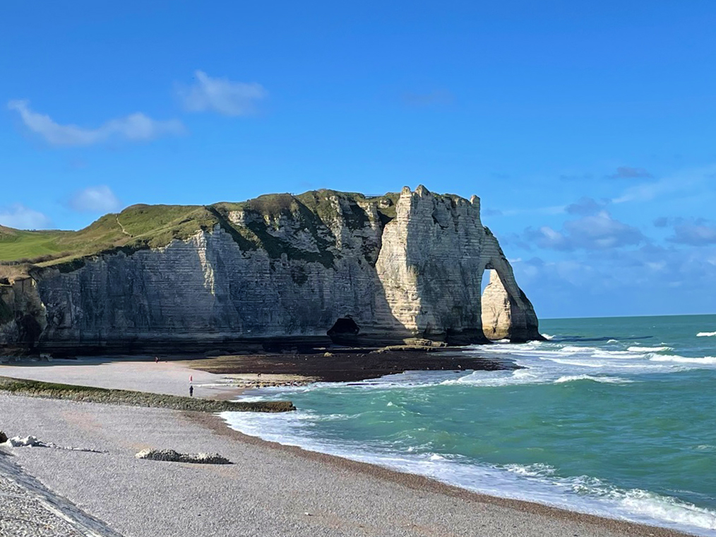 イギリス海峡に面した海岸にあるエトルタは、リゾート地としても人気が高く、ハイシーズンになると多くの観光客が訪れます。モネやクールベはたびたびこの地に滞在し、様々な角度から時間や天候を変えて絵を描きました。断崖の上は散策路になっており、訪れた日はとてもお天気が良かったので、反対側まで歩いてそこからの絶景を眺めることができました。