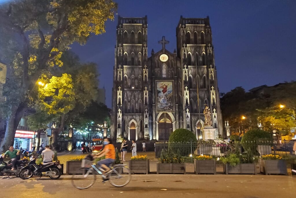 「ホテル・オリエンタル・ジェイド」は2018年建造という新しいホテルで、フロントスタッフのサービスも良好で3連泊を快適にお楽しみいただけたようです。屋上にはプールバーがあり、ハノイ屈指の眺めもお楽しみいただけました。また、特筆すべきは、その立地です。ほんの数分でハノイ大聖堂や、ハノイの憩いの場でもあるホアンキエム湖畔までの散策が楽しめます。ハノイ大聖堂のステンドグラスは必見ですし、界隈はフランスの下町のような雰囲気です。ホアンキエム湖畔では、朝に散策すると地元の方が体操やダンス、談笑している姿がそこかしこに見られ、ハノイの穏やかな日常を感じます。