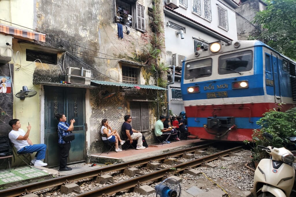 江戸城のお膝元には日本橋や人形町など商人や職人の町があったように、ハノイ旧市街はタンロン城の城下町といえます。現在も変わらず、通りごとに商品の名前がつけられており、1つ通りに同じ物を売っているお店が並ぶ、まさに職人街です。バスが入れない狭い路地ですので、私たちは電動カートで旧市街に入りこみ、ガイドさんですら滅多に案内しないディープなハノイを巡りました。走行しながらイヤホンガイドで通りごとにガイドさんが説明してくれ、ゴザ、祭祀用の飾り、銅製品、おもちゃ、お供えもの、鍛冶屋などの通りを巡りました。ハノイに残る唯一の城門、ドンハー(東河)門にもご案内しました。また、旧市街の外れには鉄道が通っていて、両脇の建物スレスレのところを線路が敷かれている最近人気の写真スポットにも立ち寄りました。日中はほとんど列車は通りませんが、私たちが訪れた時にちょうどホーチミンからの長距離列車がやってきて、通過する瞬間を間近でご覧いただけたという幸運にも恵まれました。