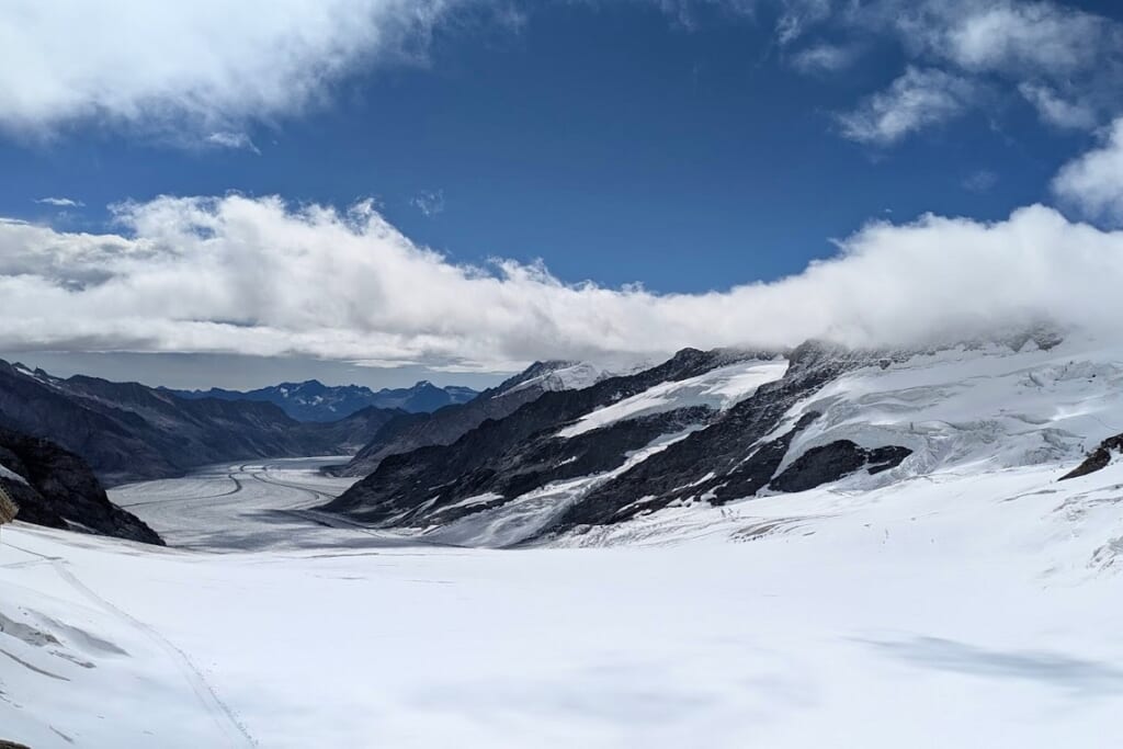登山鉄道でクライネシャイデックからユングフラウヨッホへ。山上のスフィンクス展望台は厚い雲の中でしたが、徐々に晴れに変わりプラトー展望台ではお日様も顔をのぞかせてくれました。サングラスがなければ目が開けられないほどの眩しさの雪の上を歩きました。下りは新たにできた「アイガーエクスプレス」で一気に下山、これもまたすごい迫力でした。
