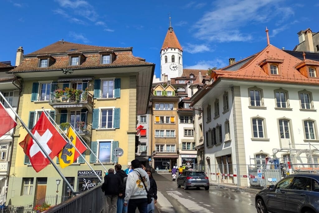 グリンデルワルト滞在の後はトゥーンに立ち寄り、スイスの首都ベルンへ列車で向かいました。時間に正確なスイス人らしく運行ダイヤはしっかり守られ安心、車両もきれいでとても快適です。駅や列車内のスタッフもとても親切でした。町の中をアーレ川が流れるトゥーンはこじんまりとした美しい町。食事のあとお城と教会のある丘に登りました。