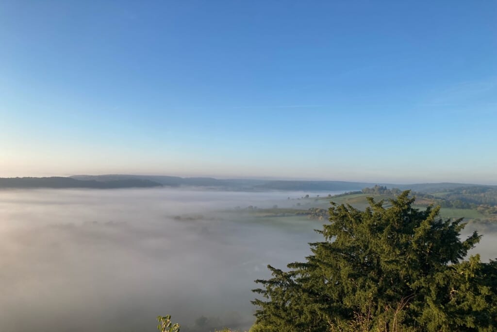 旅のハイライトのひとつでもあるヴェズレーでの滞在。「ヴェズレーの教会と丘」として1979年世界遺産に登録され、さらに「サンチャゴ・デ・コンポステーラへの巡礼路」としても世界遺産に拡張登録されたことから、人口500人程度の小さな村ながら2つの世界遺産を有しています。そのため、日中は観光客や巡礼者が数多く訪れに賑わっていますが、このたびは、参道の正面に建つホテルに宿泊。朝には、村本来の静かな様子をご覧いただけました。また、今回はラッキーなことに朝晩の寒暖差の影響で見事な雲海が出現、これも朝早くに訪れたからこその絶景でした。
