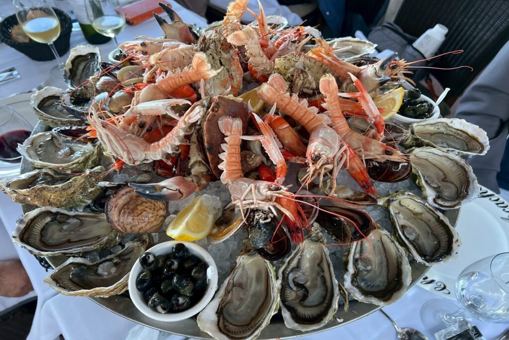 新鮮な牡蠣や海老などの魚介類を大皿に盛り付けたアルカッションのシーフードプラッター