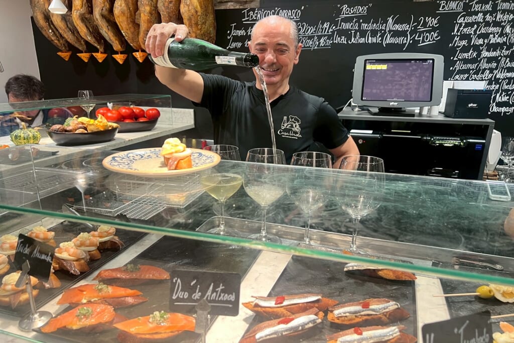 言わずもなが美食の都として知られるスペインのサンセバスチャンでは、バル巡りを楽しみました。ピンチョスやタパスといった一品料理を味わいながら、バル文化の魅力を存分に堪能。また、バスク地方の白ワイン「チャコリ」のワイナリー「GAINTZA TXAKOLI」へも訪問。「GAINTZA」はバスク語で高台を意味します。ビスケー湾近くの丘の斜面に広がる土壌で、潮風を浴びながら育ったブドウから造るワインは海のミネラルを豊富に含み、それが爽やかな味わいの秘訣となっています。家族経営とのことで、非常に熱心にワイン造りへの思いを語ってくださいました。