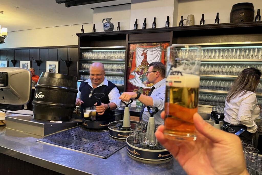 ケルンでも壮大な大聖堂をはじめとする歴史的な建造物を訪れ、古代ローマ時代から続く街の歴史にふれることができました。散策の際に立ち寄った1318年創業のケルンの地ビール、ケルシュビールのビヤホール「ブラウハウス・ジオン」で飲んだビールは最高でした。ケルシュビールの特徴は200ミリリットルの細長いグラスで、冷たいビールを「くいっ」と気軽に一杯楽しむことができたのが良かったです。