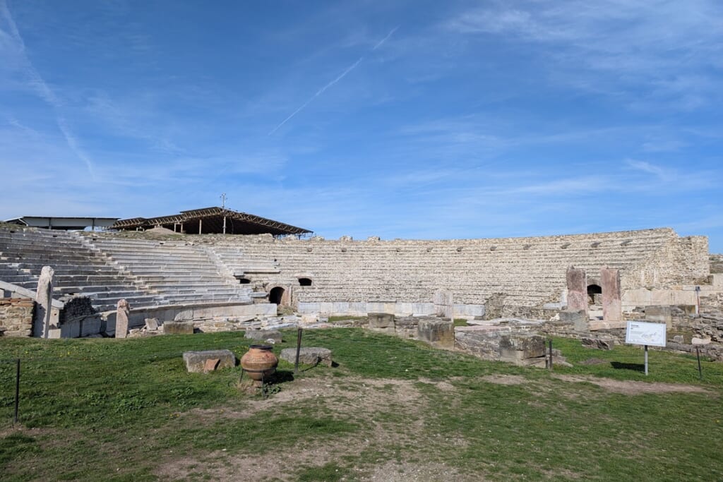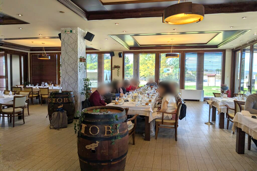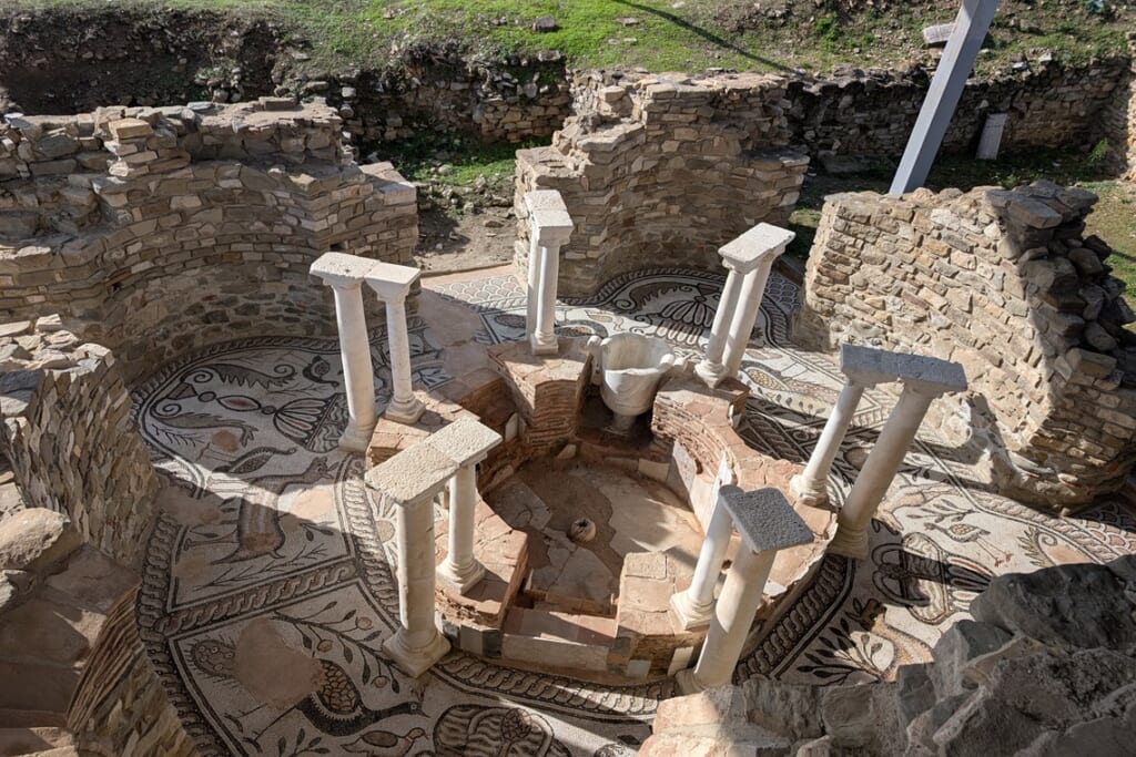 また古代ローマ遺跡が残るストビ遺跡へ訪問。ここには紀元前3世紀に築かれた町があり、現在2割ほどが発掘されています。半円形の劇場やバジリカと洗礼所、居住区、共同浴場などがあり、当時はどのように生活していたんだろうと想像を膨らませながら見学しました。バジリカと洗礼所にはきれいなモザイクが残っていて、現在の紙幣に使用されている孔雀のモザイクがありました。そして遺跡の近くにあるワイナリーで昼食。1皿ごとに食事に合わせたワインを出してくれ、北マケドニア固有品種の赤ワインも楽しみました。