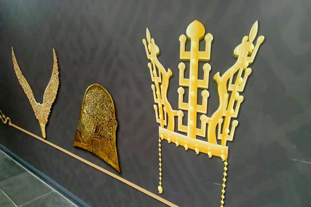 天馬塚古墳内で紹介される出土品のレプリカ。右端の金冠が出土したものです