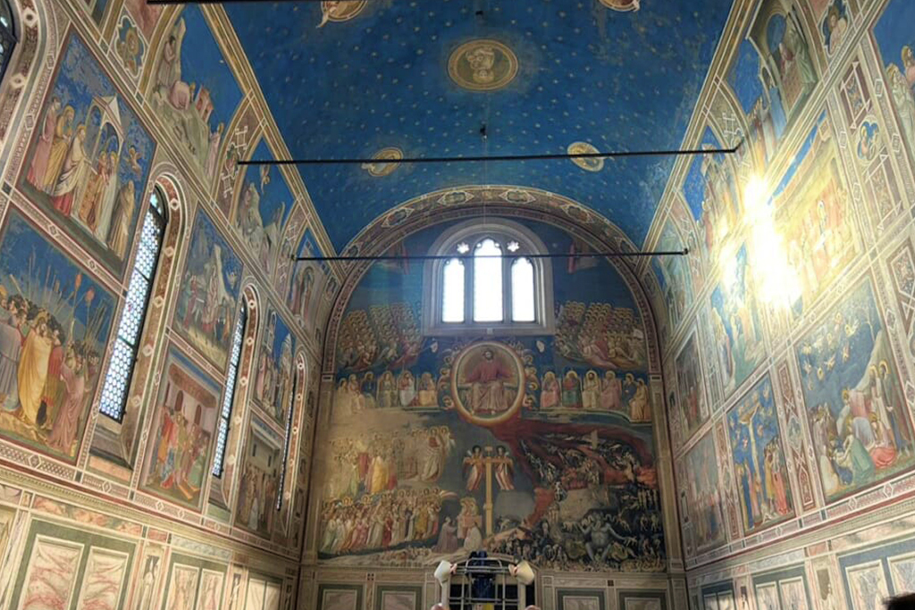 紀元前9世紀頃には町として機能しており、ローマに次ぐ「富裕の町」と呼ばれていました。1222年にはイタリアで2番目に古いパドヴァ大学を創設。ガリレオ・ガリレイなど多くの著名人が教壇に立ち、ベネチア共和国の繁栄を支える人材を輩出した由緒ある大学です。町の散策では、サンタントニオ聖堂やラジョーネ宮をご案内。ロマネスク、ゴシック、ビザンチン様式が融合した建築を見学し、趣のある町並みをじっくりと楽しみました。巨匠ジョットのフレスコ画で有名なスクロヴェー二礼拝堂も訪ね、キリスト教会では大変珍しい聖母マリアの両親の物語が一面に描かれる、美しい壁画をご覧いただきました。