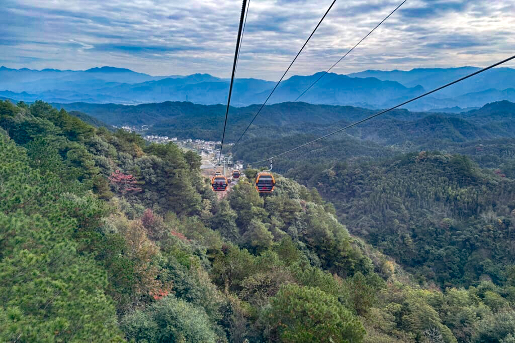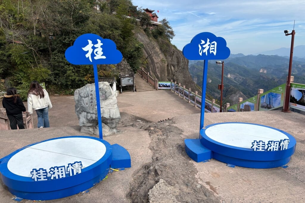今回の旅の最大の見どころは、世界遺産に登録されている崀山(ロウザン)です。崀山は堆積岩が隆起してできた独特の地形を持ち、様々な角度から異なる表情を見せる奇岩群が特徴です。八角寨景区では、2025年5月に開通したばかりの全長1,226メートルのロープウェイに乗車。10分弱であっという間に最初の展望台に到着します。このロープウェイが開通するまでは、2人乗りのリフトでゆっくりと山頂を目指すしかなかったそうです。着後は景色を楽しみながら、少し歩いて標高818メートルの山頂を目指します。山頂の展望台からは、赤い堆積岩で形成された切り立った断崖と、「鯨魚閙海(ジンユー・ナオハイ)」と呼ばれる絶景が広がります。鯨魚閙海は「鯨の海遊び」という意味で、まるで無数のクジラが海で戯れているかのような奇岩群が眼下に展開されていました。