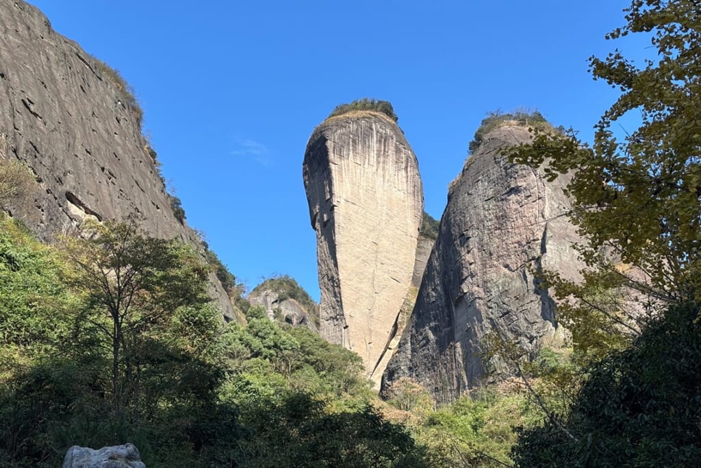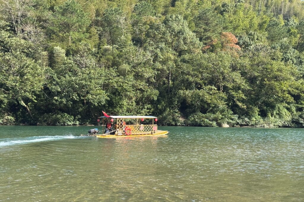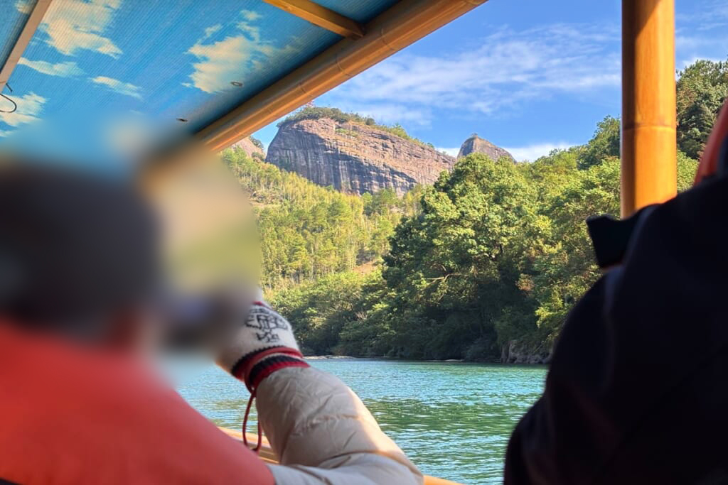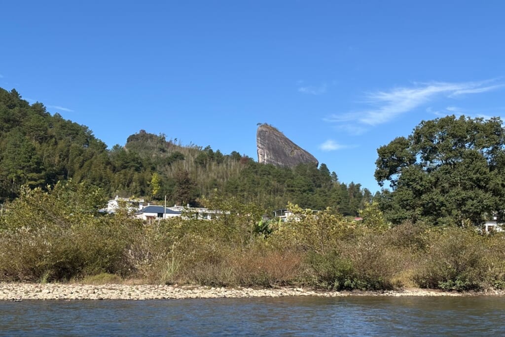 午後は扶夷江景区で竹製ボートに乗船し、水上から両岸の景色を楽しみました。カエルの形をした岩、毛沢東の涅槃像のような毛公山、軍艦に似た岩など、想像力をかき立てられる奇岩が次々と現れます。クライマックスには将軍が遠くを眺めているように見える、高さ75メートル、幅20メートルの将軍石が見えます。