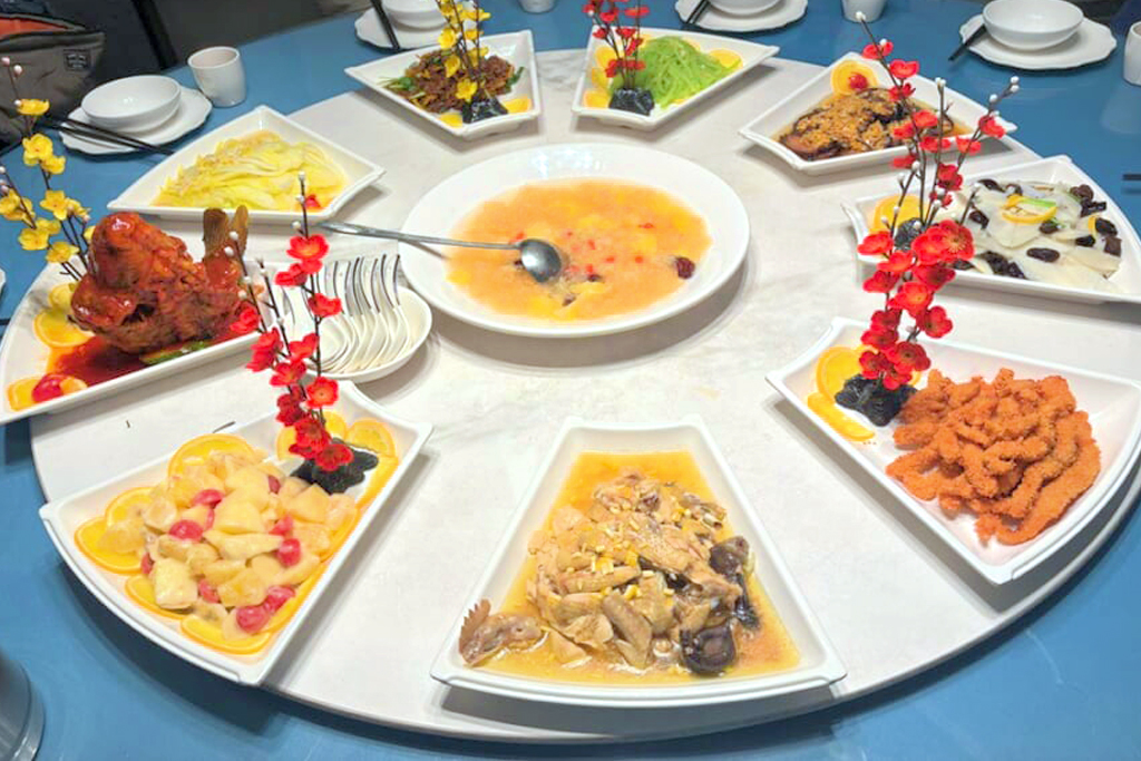 崀山観光の最後は辣椒峰景区へ。その名の通り、唐辛子に似た形の辣椒峰が目の前に飛び込んできます。電気カートで移動した先に現れるこの峰は、片道2時間ですが登ることも可能だそうです。石田村では、西日が眩しい時間帯にラクダ峰と蝋燭峰を観賞しました。ラクダ峰はその名の通り、遠くから眺めるとラクダの頭、背中のこぶ、尾に分かれているように見えます。他の奇岩もそれぞれ何に似ているかを想像しながら楽しみました。夕食は崀山名物のネーブルオレンジを使った、見た目も美しい「柑橘宴」をご用意しました。