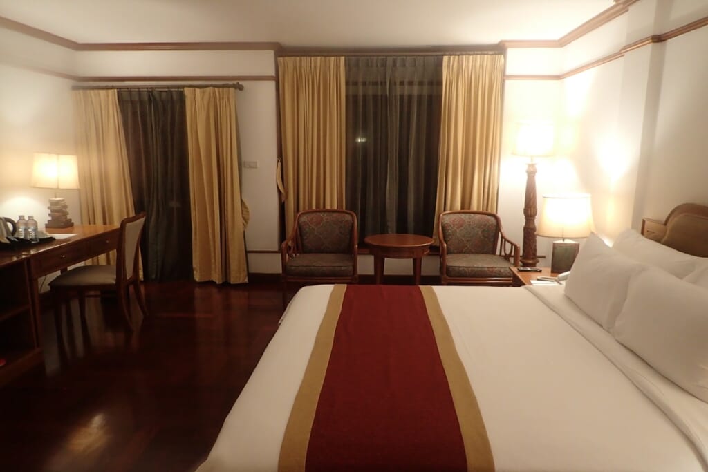 カンチャナブリーでは「森のリゾート」として、「フェリックス・リバー・クワイ・リゾート」に3連泊。クワイ川沿いに広大な敷地を有し、屋外プールを囲むようにメイン棟のほか20棟のヴィラ(うち、宿泊ヴィラは18)が点在します。敷地内にはところどころに中庭があり、川岸に出ればクワイ川鉄橋も見ることができます。朝夕で空の色が変わると雰囲気も変わってゆくので、いろいろな時間帯にホテル敷地内を自由に散策いただき、滞在を存分にお楽しみいただけました。客室はタイの伝統建築のヴィラで、利用したデラックス・ルームは45㎡程度と広々としていました。