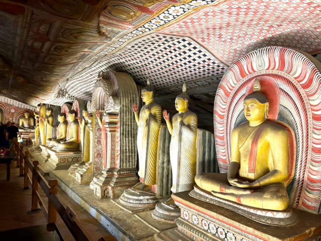 ダンブッラの石窟寺院では、紀元前1世紀から紀元18世紀までに造られた仏像が安置されており、巨大な涅槃像が横たわる第一窟、天井から聖水の滴る第二窟、黄金の仏陀像が並ぶ第三窟、セメント・レンガで造られた仏像が並ぶ第四窟、五窟と順番に見学。仏教美術の変遷を感じることができました。