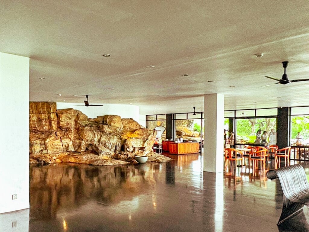 今回の旅では、バワが手掛けた3つのホテルに宿泊しました。初日の「ジェットウィング・ビーチ」では、アジアンリゾートの雰囲気を満喫。2日目から宿泊したダンブッラの「ヘリタンス・カンダラマ」、バワ唯一のマウンテンリゾートで、岩山を背景に森の中に溶け込むように建てられています。剥き出しの岩がそのまま残る廊下やロビーに、自然との一体感を目指したバワの哲学を感じました。