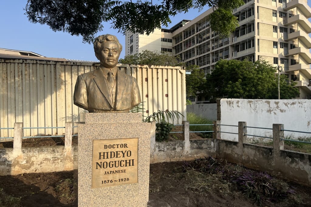 アクラにあるコルレブ病院を訪れました。ここは野口英世が黄熱病の研究に情熱を注ぎ、最期を迎えた場所です。記念館には彼の業績を称える展示があり、日本から遠く離れた過酷な環境の地で、母へ宛てた手紙や当時の顕微鏡、「忍耐」の自筆を目の当たりにし、胸にせまる思いでした。