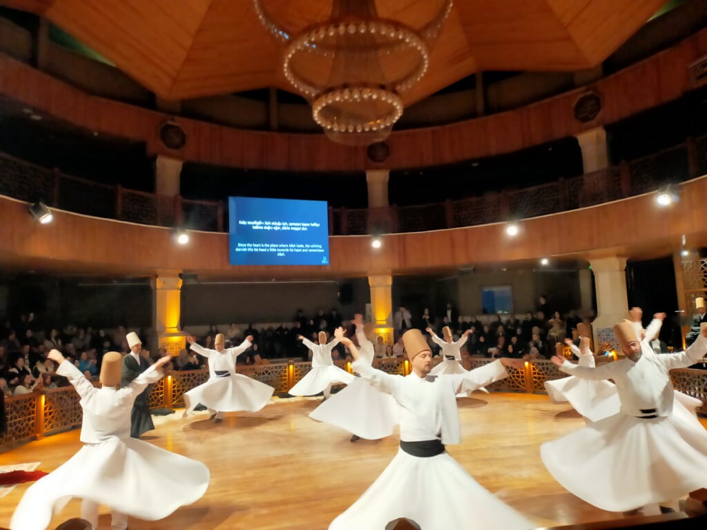 コンヤはセルジュク朝の都であると同時にメヴラーナ教の総本山でもあります。しかもこの時期はメヴラーナ教の創始者メヴラーナ・ジェラールディン・ルーミーの命日が12月14日であることから、今も巡礼者が絶えず、この日の前後約1週間は「メヴラーナ旋舞祈祷」が行われます。私たちも特設会場で旋舞祈祷を見学しました。メヴラーナ教の信者たちが円形の舞踏会場でクルクルと回り続ける姿には神々しさを感じずにはいられません。感動のひと時でした。