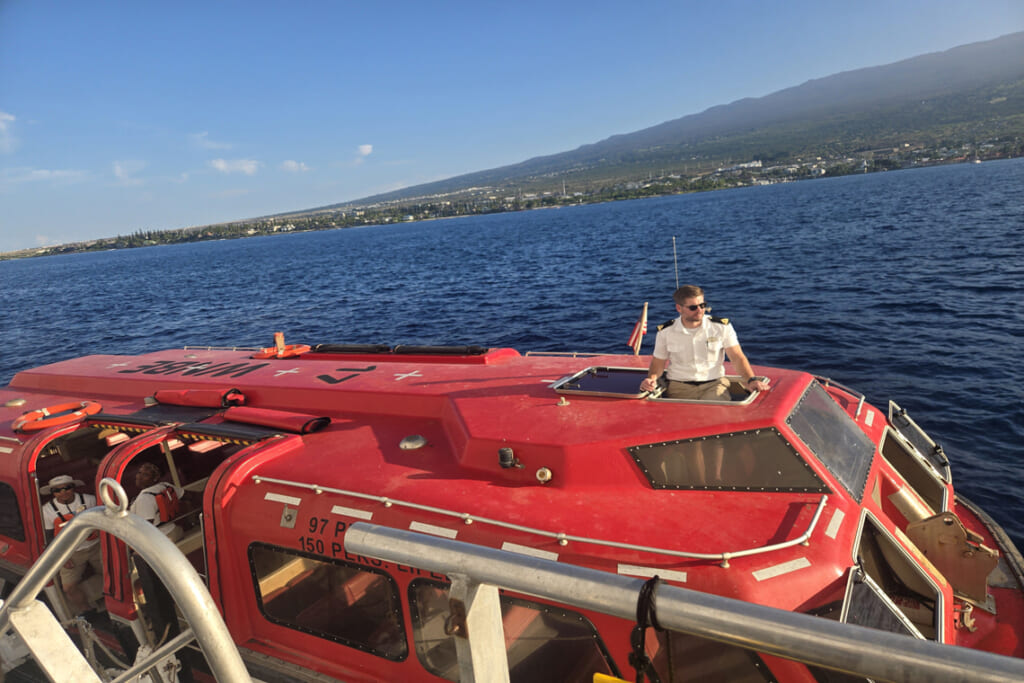 テンダーボートでコナに上陸します