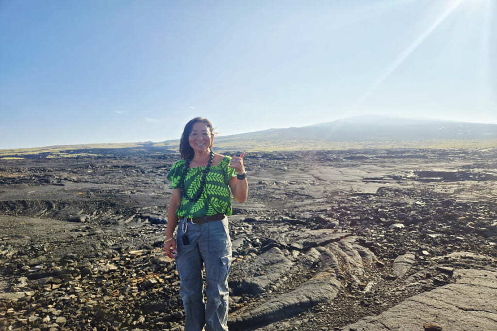 アロハポーズの日系現地ガイドさん。コナのマグマは粘着質。固まった上を歩くと地球のパワーを感じます!