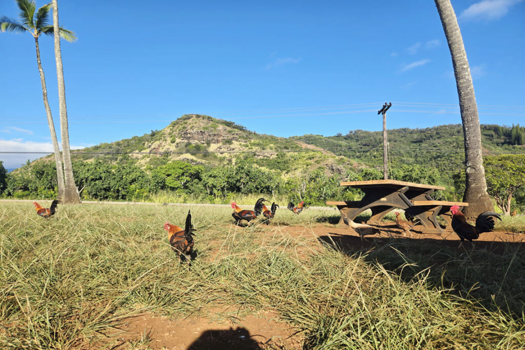 ワイメア渓谷は「太平洋のグランドキャニオン」とも呼ばれる、カウアイ島随一の絶景スポットです。赤や茶色に染まった断崖と、谷底に広がる緑が見事で、ハワイのイメージを良い意味で裏切るスケール感があります。この場所は手つかずの自然が残りすぎて、人間を全く警戒しない野生のニワトリが沢山生息していました。