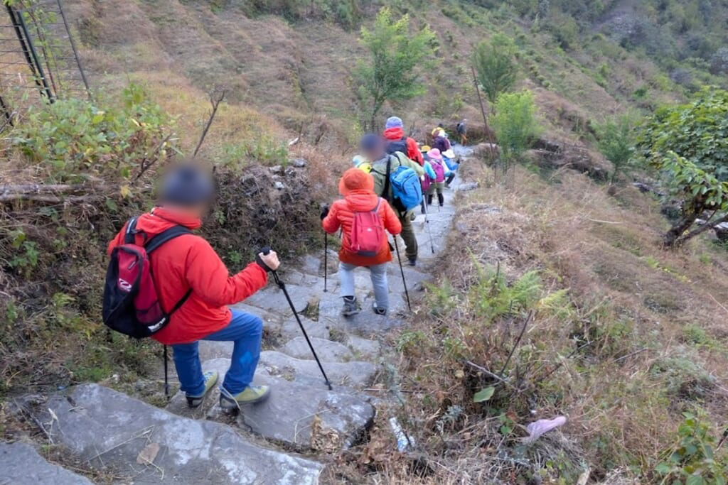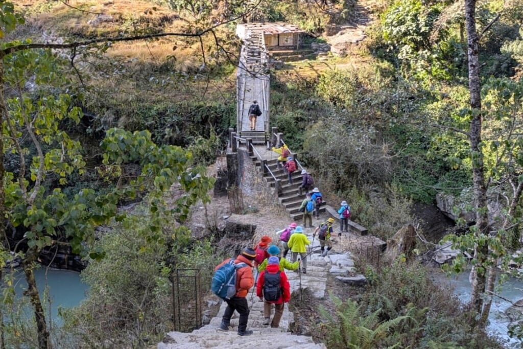 この日も美しい山の姿を見ながらロッジを出発。ランドルックからガンドルックへは、いったん谷底まで降りて川を渡り、今度はひたすら山登り(ほぼ全てが階段)のルートです。急な石段を一歩一歩、この道も村の人たちが石を運び上げ、ひとつひとつ積み上げていったのだと思うと気が遠くなります。昨日よりも慎重に、休憩を多めに取りながら進みました。吊り橋を渡って少し行ったところでランチタイム。地元のおばさんがやっているローカルレストランでネパールの定食「ダルバート」をいただきました。エネルギーを補充し、午後もひたすら登り道を黙々と歩き続けました。