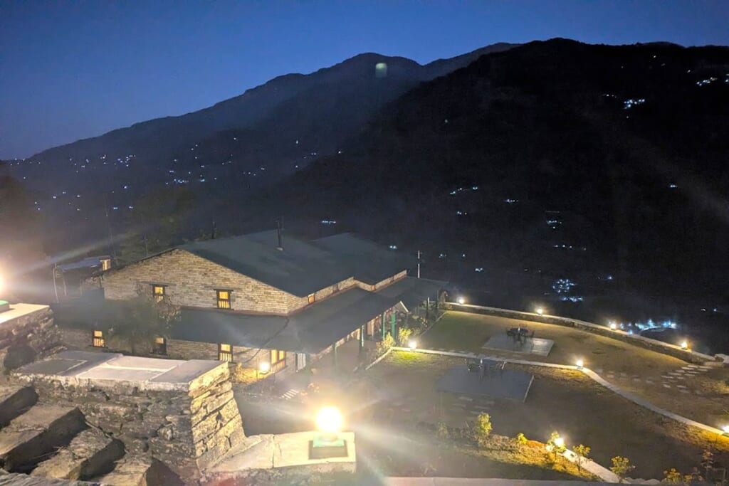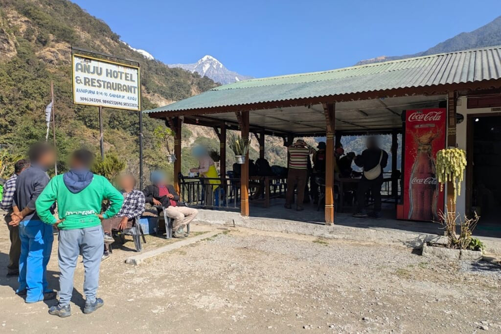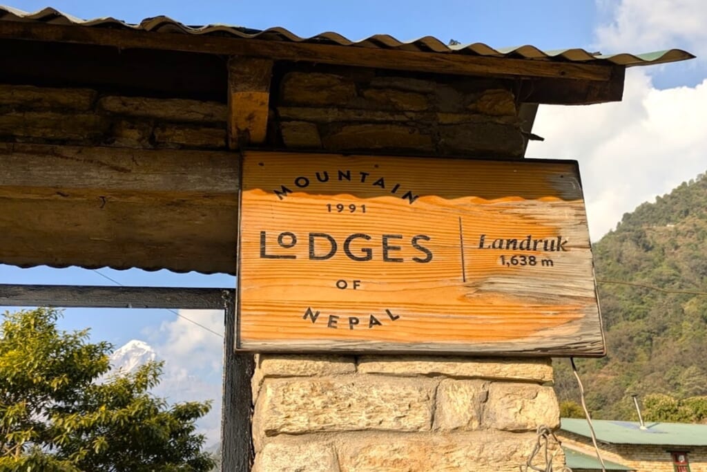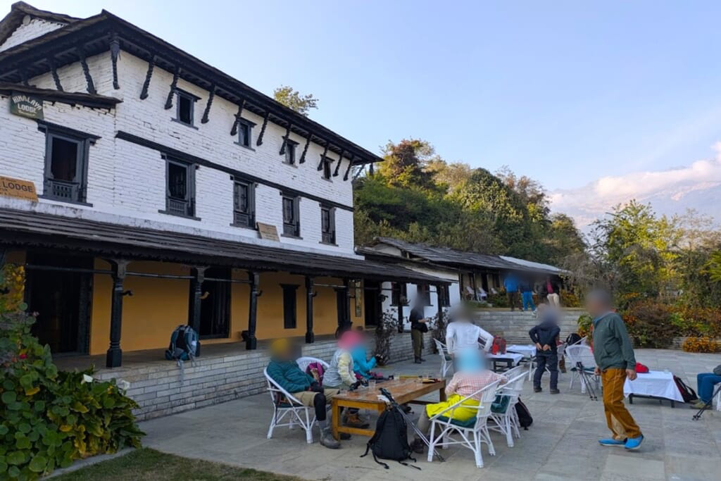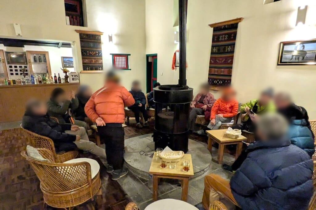 歩き始めて約5時間30分、途中で何度かの休憩とランチタイムを取り、ようやくトレッキング1日目の目的地であるランドルックのロッジに到着しました。スタッフが用意してくれたはちみつレモンジュースとおしぼりが、体と心に染み入りました。先に到着していたポーターさんからそれぞれの荷物を受け取り、ロッジの部屋へ。こんな山深い場所でも温かいシャワーが出て感激! 夕食前には薪ストーブを囲んで皆様で談笑、歩ききった後のこの時間は最高でした。