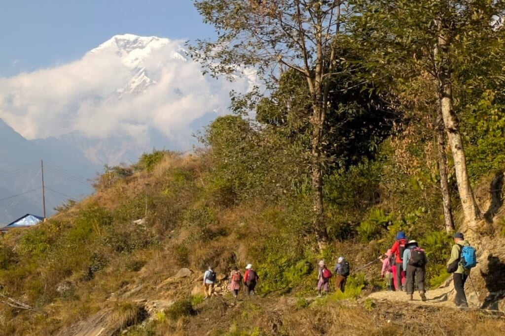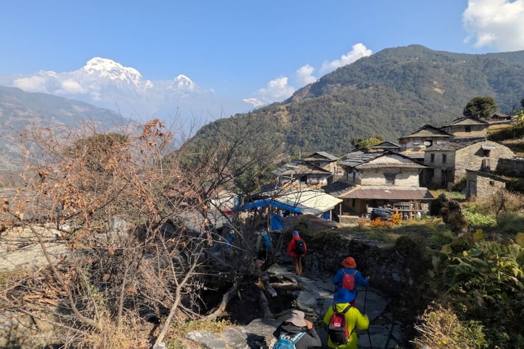 マジガオンの小学校で車を降り、山歩きのポーターさんたちに荷物を持ってもらい、いざトレッキングに出発! 石の壁にスレート葺の屋根が特徴的なグルン族の家並みの間を通り抜け、アンナプルナ・サウスを目に捉えながら快調にスタートしました。村の人たちが洗濯をしたり体を洗ったりするのどかな風景が広がっていますが、ガイドさんによると若者の多くが都会へ出て行き、空き家が増えているとのことでした。