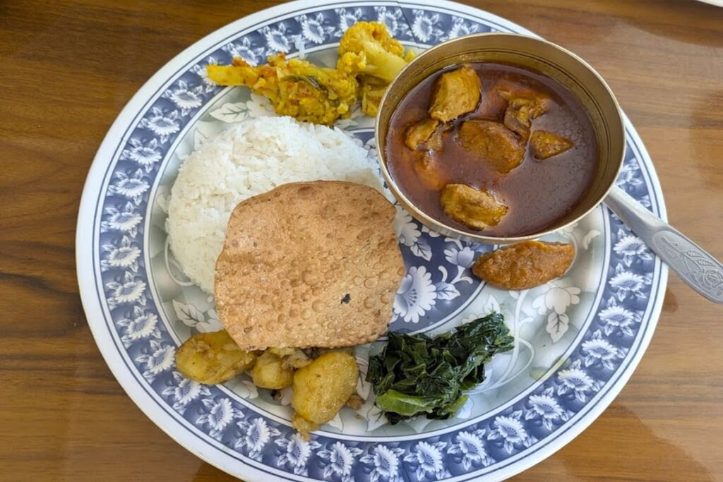 ご飯にチキンカレー、青菜炒め、漬物などネパールのおふくろの味