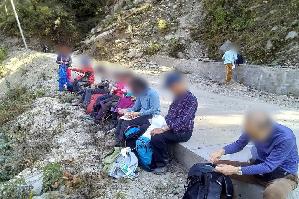 歩き始めて1時間ほど、水分を取りながらゆるやかな上りの道を進みます。皆様まだまだ足取りも軽く、雄大な山々や山里に暮らす人々の生活、足元に咲く花などに目をやりながら快調に歩きました。午後1時を過ぎたころ、適当な場所を見つけてランチタイム。ホテルで用意してくれたサンドイッチがとても美味しかったです。午後も快調に歩き、スタートから約5時間、目的地のランドルックの集落が見えてきました。