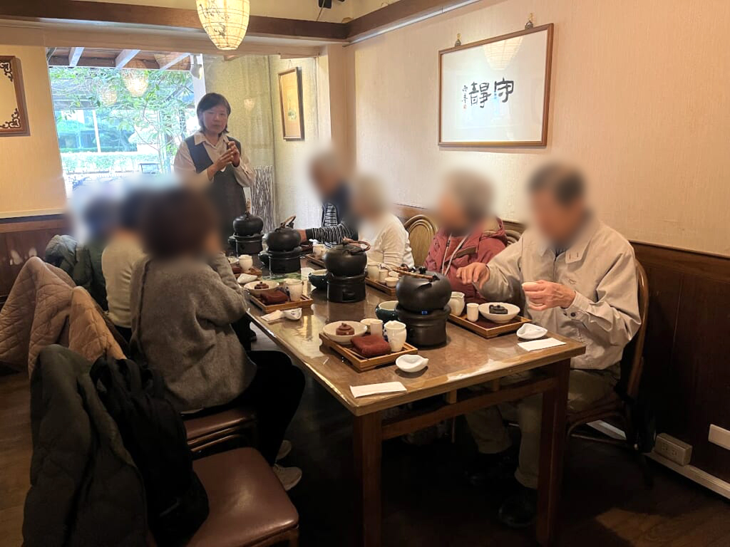 台湾文化を代表する茶芸館。落ち着いた空間の中で、本場の台湾茶の淹れ方を実演付きで教えていただきました。お湯の温度や茶葉の開き具合、香りの立ち方まで一つひとつ丁寧に説明があり、「ただ飲むお茶」ではなく、味わいを楽しむ文化そのものを体験する時間となりました。実際に皆様にもお茶を淹れていただき、「香りが全然違う」「まろやかで飲みやすい」と感動の声も。旅の途中でほっと一息つきながら、台湾の奥深い「お茶の世界にふれる、心に残るひとときとなりました。