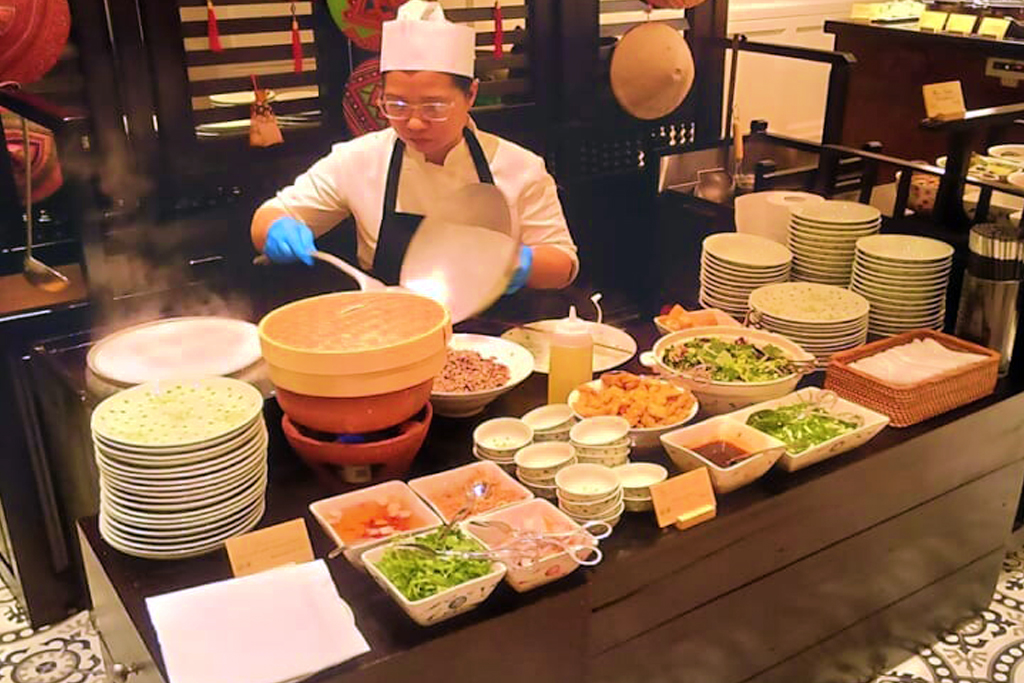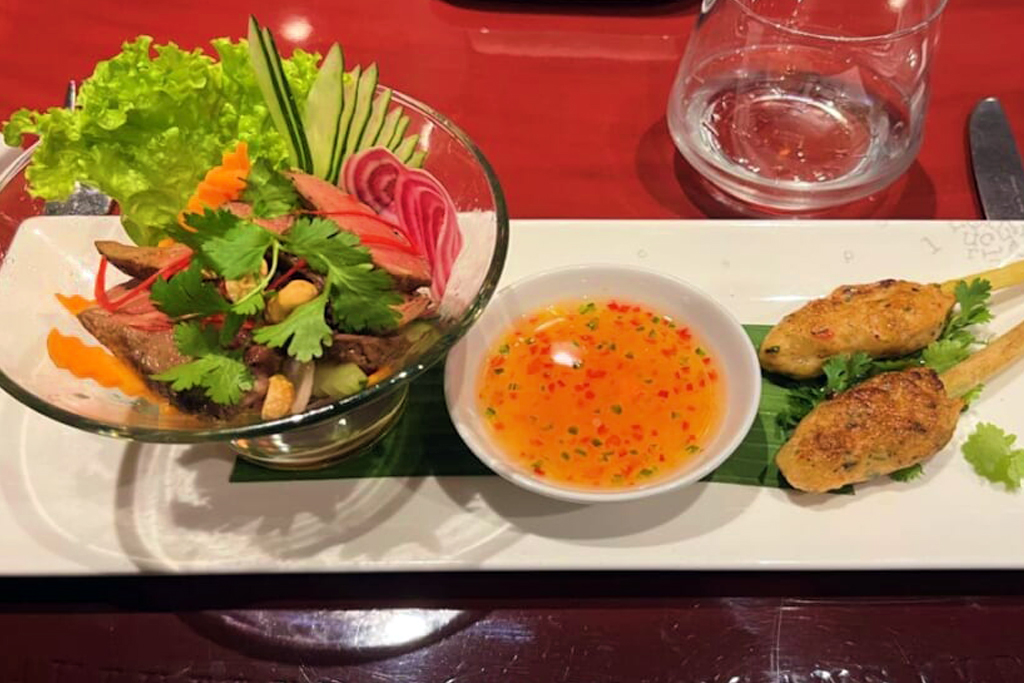 1日目はホテルの向かいにあるプレスクラブ内の「ラ・ターブル・ハノイア」で、モダンに昇華した創作ベトナム料理をいただきました。このレストランはかつて海外からのジャーナリストや特派員が集う場所でしたが、今では複数の選抜されたレストランが入っており、多くのお客様で賑わっていました。鴨肉や鮭など日本人好みの食材が多く使われ、盛り付けも丁寧で大いに食欲をそそるもので、初日から満足感いっぱいの夕食となりました。