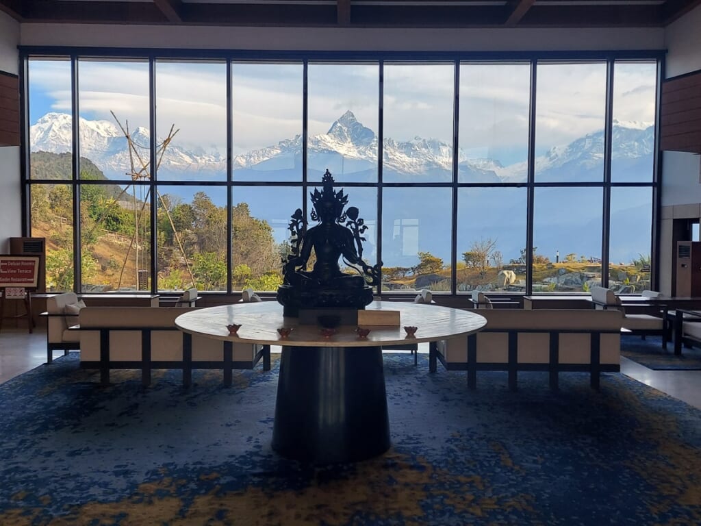 ポカラではサランコットの丘に建つ、絶景ホテル「ホテル・アンナプルナ ビュー」での3連泊を楽しみました。到着日だけは曇りがちだったのですが、その後の3日間はほぼ快晴。ホテルのお部屋に居ながらにして、見事な「アンナプルナ連峰」の雄姿をご覧いただけました。ホテルの責任者として駐在している社員の井本も「これほど風もなく見事にご覧いただけるのは稀」とのこと。朝日、夕暮れともに何回見ても飽きないほどでした。