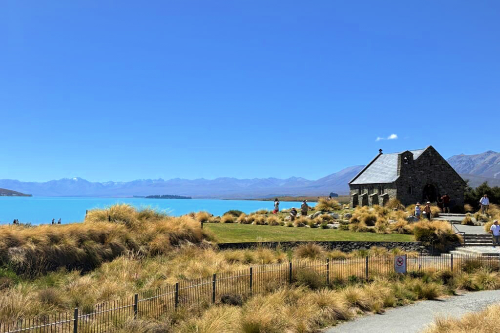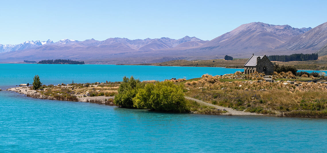 テカポ湖には、絵葉書やポスターの定番となった景色が広がっています。サザンアルプスより長い年月を経て削られた大地はフィヨルドへと変わり、そしてそこに水が溜まって雄大な湖をつくり上げます。特に氷河湖の色は岩石の成分が溶けだすことからミルキーブルーの独特の色味をしていて、つい写真を撮りたくなる景色が広がっています。