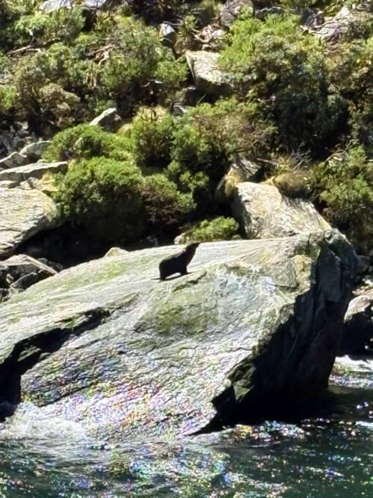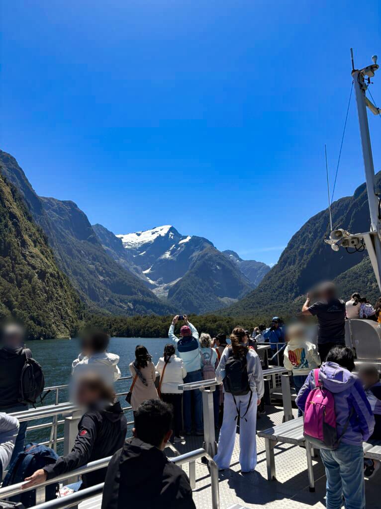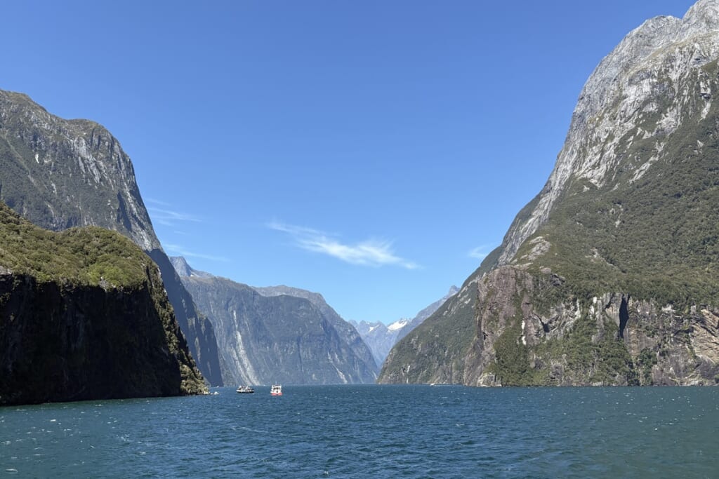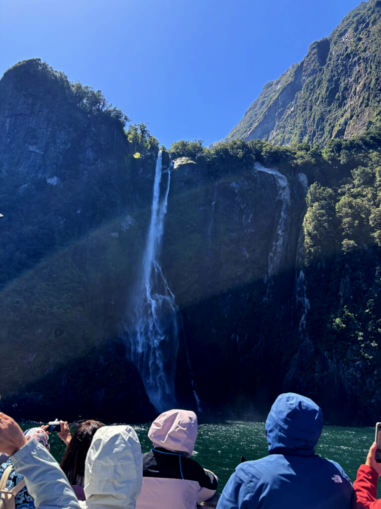 年間200日以上が雨か雪といわれるミルフォードサウンドで、雲一つない青空に恵まれることは本当に珍しいです。乗船後は船内でビュッフェスタイルの昼食をお召し上がりいただき、その後は右に左に切り立った山々や流れ落ちる滝をご覧いただきました。日向ぼっこ中のアザラシにも遭遇。次から次へと景色が切り替わるので、2時間のフィヨルドクルーズがあっという間に感じられました。