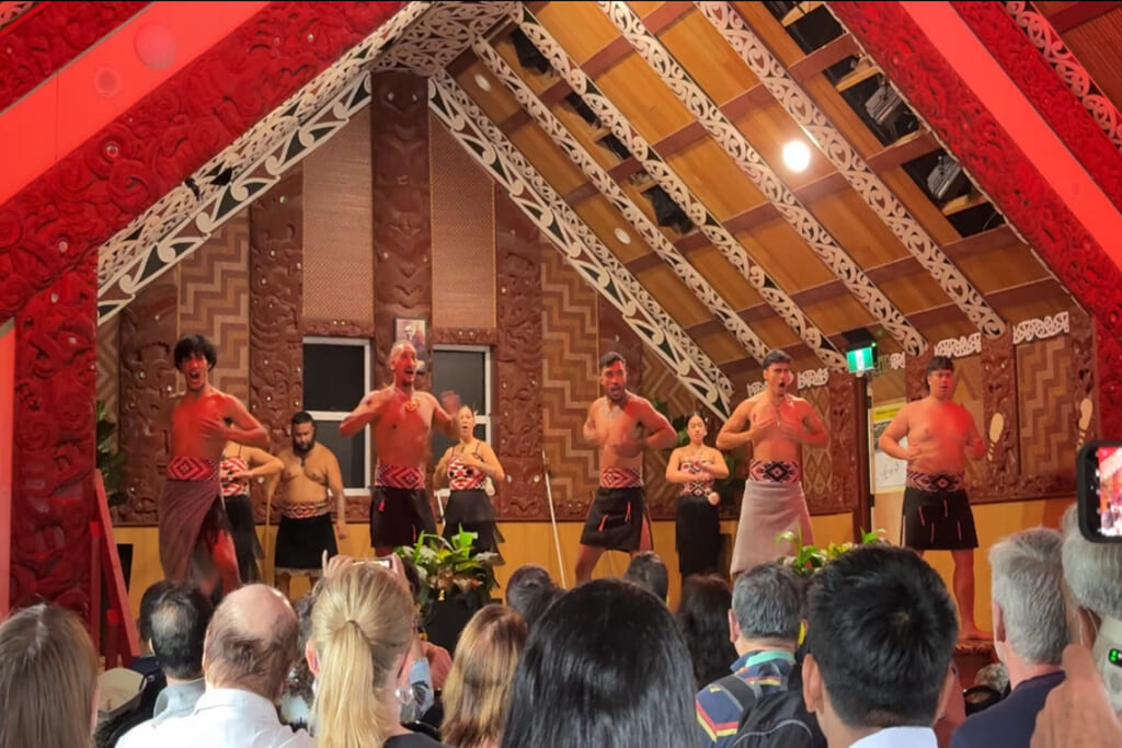 北島は今もなお火山活動が活発で、泥のプール(泥温泉)では地下からの熱と蒸気が泥を熱し、ボコボコと沸き上がり、地球が「生きている」ことを実感させられました。地熱活動が活発なロトルアでは、先住民族・マオリ族の文化が色濃く根付いています。そんなロトルアには、マオリ文化とニュージーランドの自然を目の前で体験できる施設・テ・プイアがあります。ポウフィリと言われるマオリの伝統的な装飾が施された集会所マラエへの入場の儀式体験とハカを鑑賞。非常に力強い演舞に引き込まれ、私たちもかつてのポウフィリに参加をしていると錯覚するような躍動感のある歌や踊りでした。また、地熱を利用して食材を蒸すマオリ族の伝統料理ハンギもご用意しました。