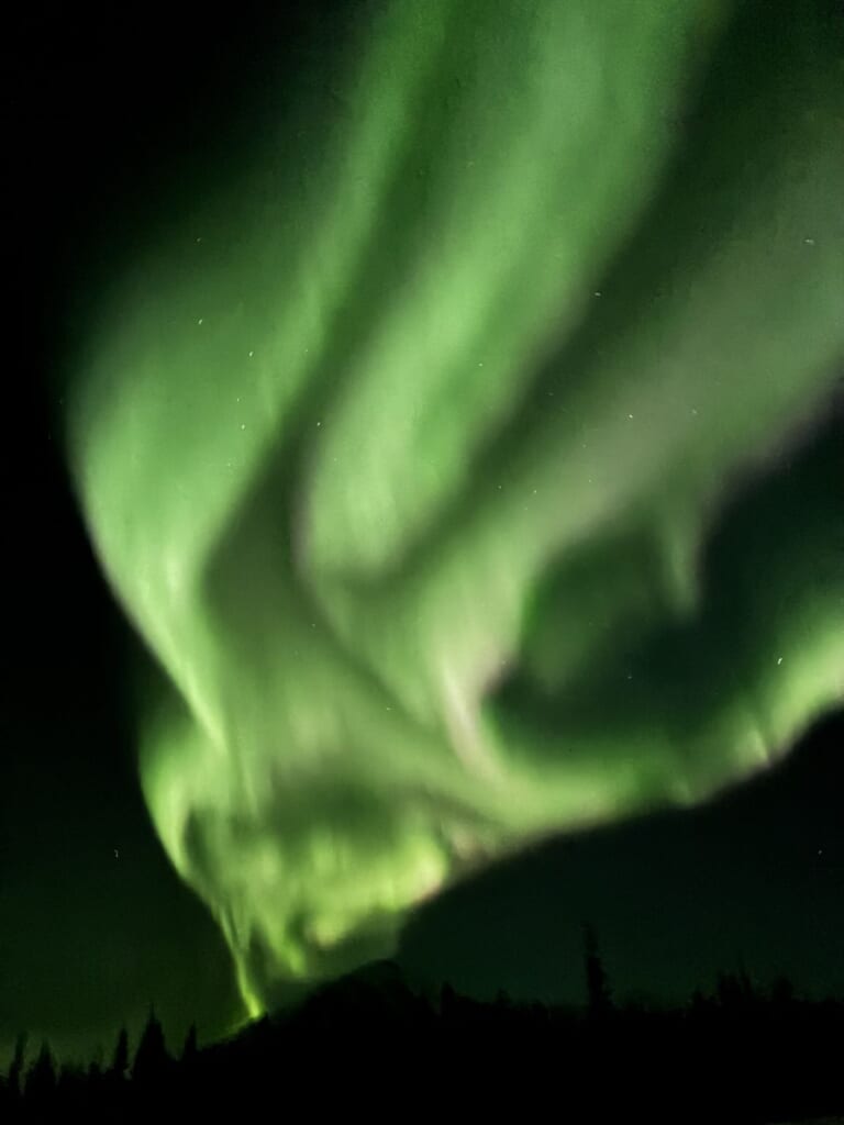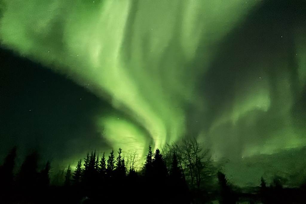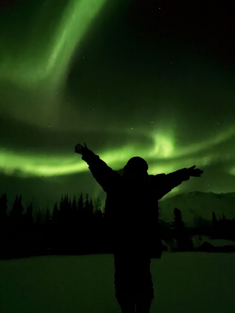 冒険家 植村直己氏が訓練のため滞在した近隣のワイズマンの猟師小屋へ移動し、二夜連続のオーロラ観測がかないました。緑色の光の帯が音もなく夜空をうねるように広がり、まるで生き物のように形を変えながら、やがて空一面を覆いました。旅の前半は天候に恵まれず不安もありましたが、それを払拭する見事な光景に皆様大満足。アラスカを何度も訪れている方からも「これまでで一番美しいオーロラ」との声が上がりました。