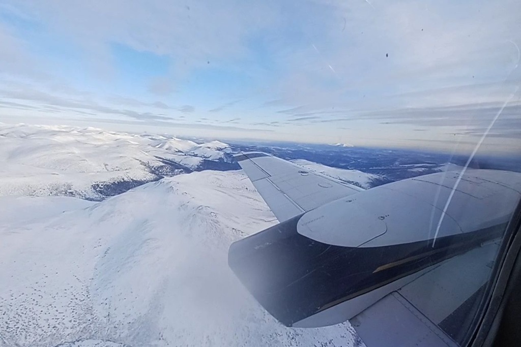 北極圏への玄関口ともいわれるコールドフットに連泊。人口わずか17人、ダルトン・ハイウエイを行き交うトラックの緊急避難所兼小さな休憩地。名の由来は、ゴールドラッシュ時代に寒さに怖気づき引き返した人々から。滞在最終日、帰路はセスナ機に分乗してフェアバンクスへ。陸路で約8時間かかった道のりも、空路ではわずか1時間10分です。眼下にはブルックス山脈の稜線と、凍結したユーコン川の白い帯。地上では決して見られない角度から、北極圏の大地を一望しました。