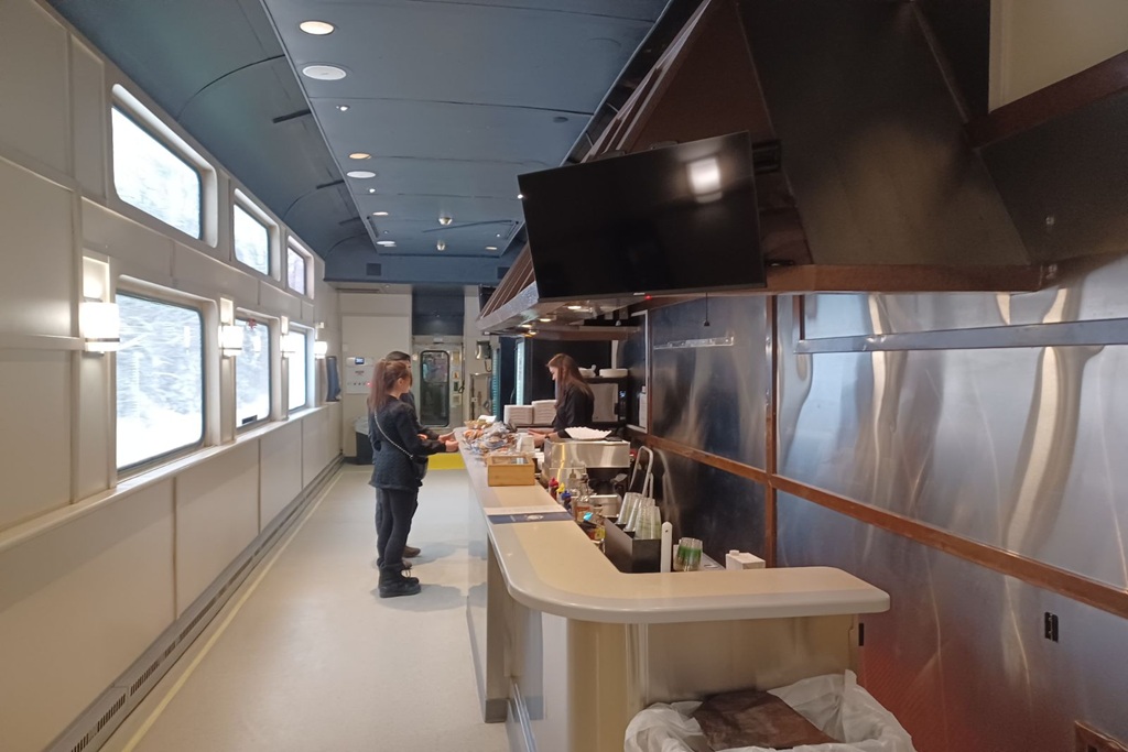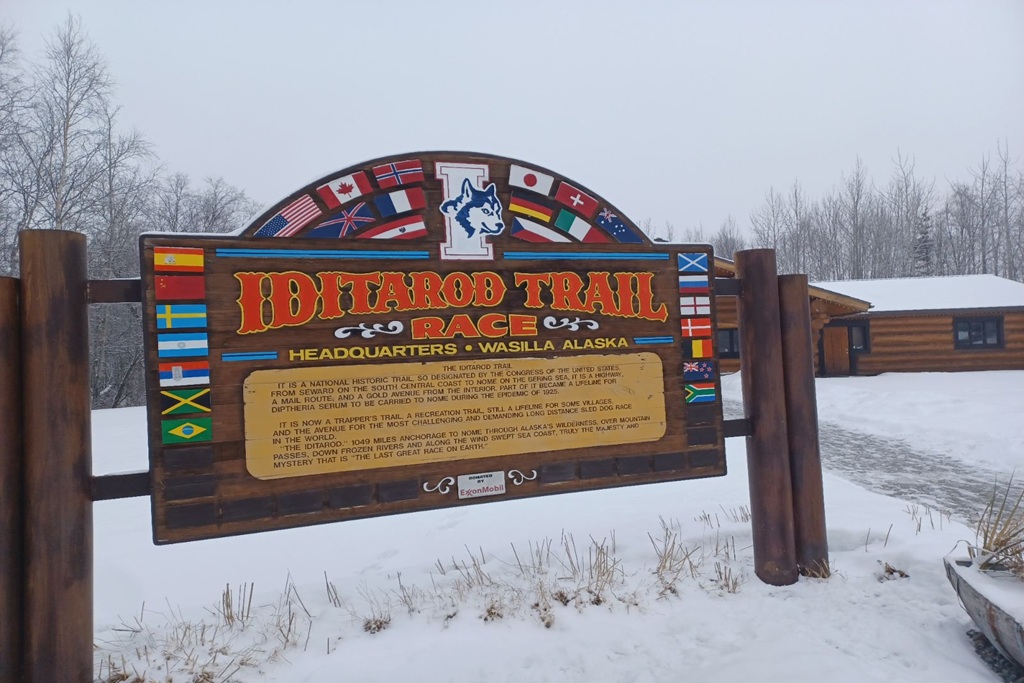 アラスカ鉄道は、港町スワードからフェアバンクスまで、約760kmを結んでいます。車窓からは凍結した川やアラスカ山脈の白い峰々、針葉樹の森が続く雄大な景色を楽しみました。この列車の面白いところは、乗客が手を振ると停車したり、時には家の前でも止まったりすること。その自由さも広大なアラスカならではです。終日の列車移動でしたが、車窓に広がるアラスカの大自然は実に見事でした。