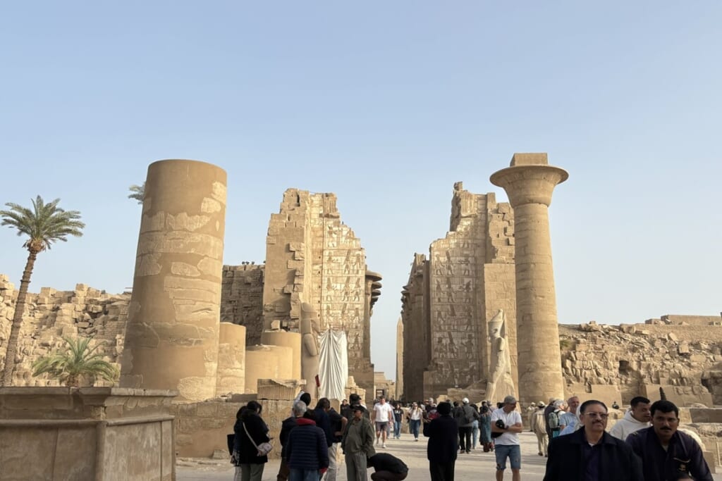 ルクソールは、古代エジプトで「テーベ」と呼ばれ、新王国時代には首都として栄えた重要な都市です。ナイル川を挟んで東岸と西岸に見どころが分かれており、太陽が昇る方向の東岸は「生者の町」とされ、カルナック神殿やルクソール神殿など、神々に捧げられた壮大な神殿群が残されています。一方、太陽が沈む場所、西岸は「死者の町」とされ、王家の谷、ハトシェプスト女王葬祭殿、メムノンの巨像などがあり、王たちの墓や葬祭の遺構を見学しました。