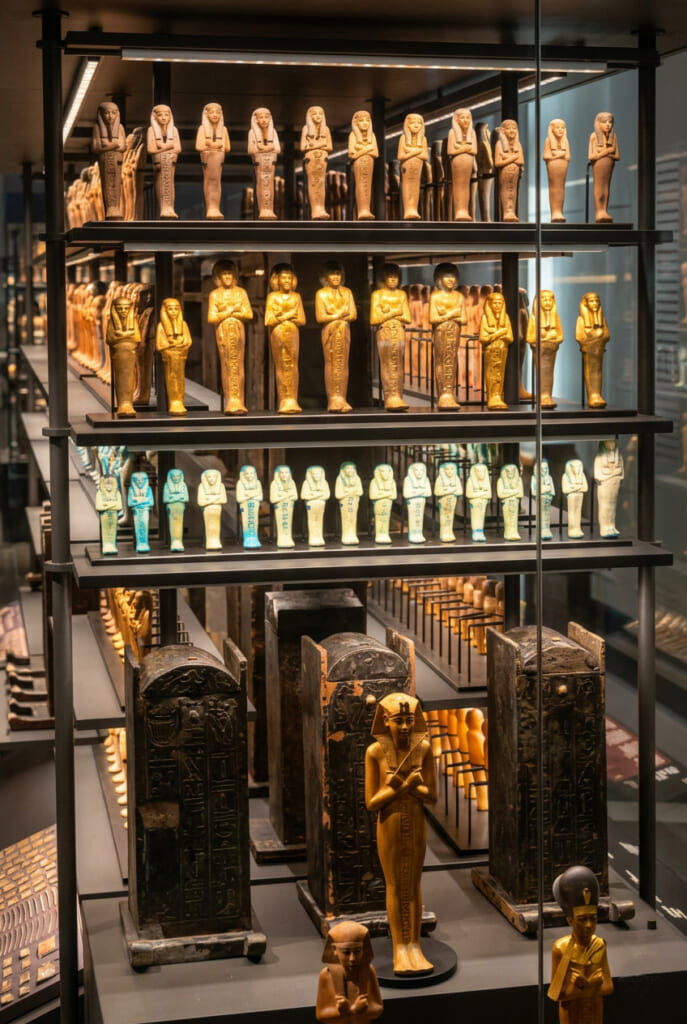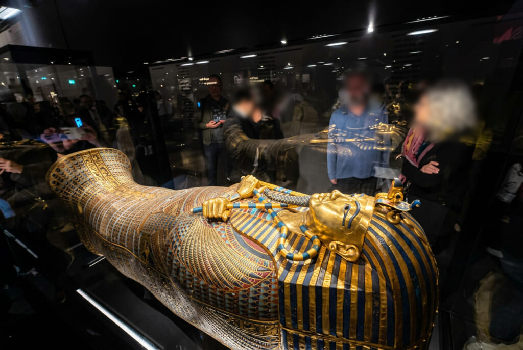 長いエスカレーターを何度も乗り継ぎ、いよいよ入場。館内にはツタンカーメン王墓から出土した約5,000点にも及ぶ副葬品が展示され、ツタンカーメンのマスクをはじめ撮影が許されていました。以前、展示されていたエジプト考古学博物館ではツタンカーメンに関する展示部屋は一切撮影禁止でしたが、GEMではツタンカーメンのマスクと一緒に写真を撮ることもできるのも魅力でした。マスクの他、マトリョーシカのように幾重にも重なり、作られた棺や厨子、ベッド、戦車などの大物、さらに王に仕える人の像、草履や褌などの日用品、食品まで、あの世でも現世と同じように生活ができるように色々な物が埋葬されたのがわかりました。