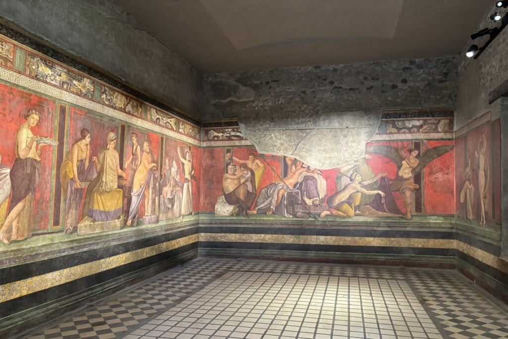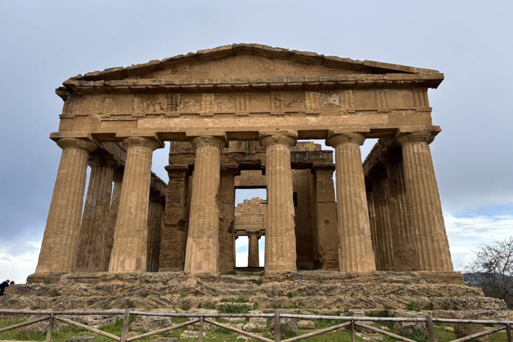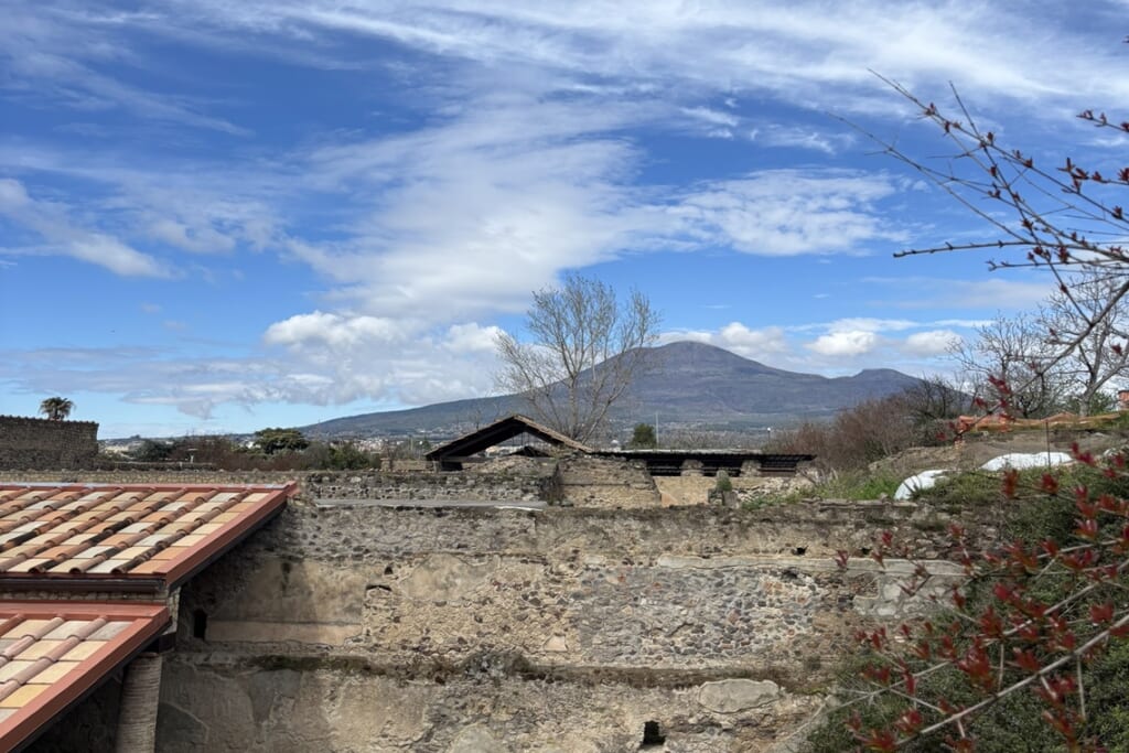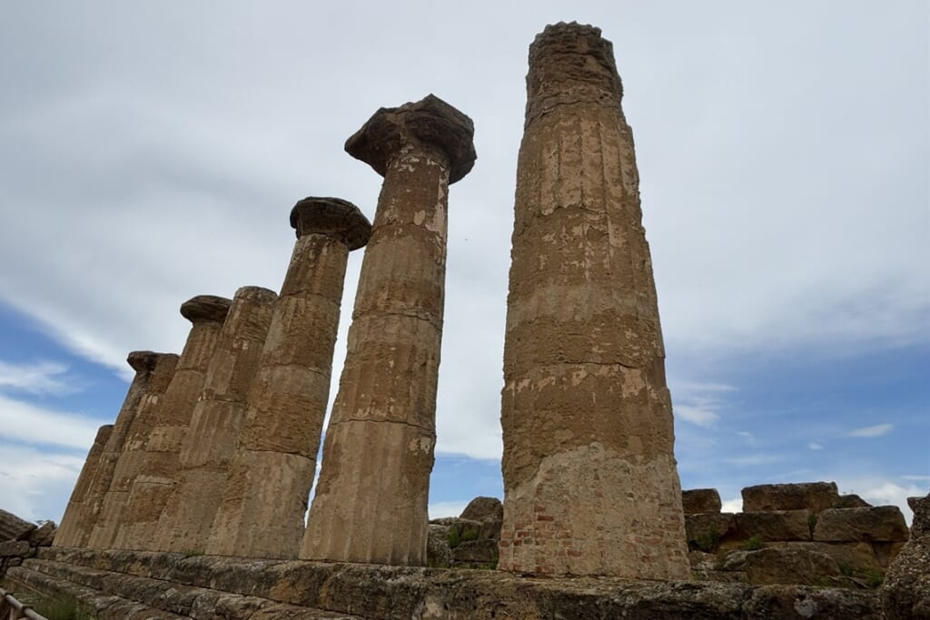 ローマとギリシャ、2つの古代文明が残した遺跡群が見られるのもこの旅の魅力の一つです。ナポリ近郊のポンペイは、西暦79年のヴェスビオ火山の噴火により火砕流に飲み込まれ、地中に埋もれた古代都市です。公共浴場や竈の残るバールなど、当時の暮らしぶりが生々しく伝わる遺構も印象的でした。また、シチリア島南部のアグリジェントでは、「神殿の谷」を歩きました。紀元前5世紀頃に建設されたヘラ神殿、保存状態の良いコンコルディア神殿、最古のヘラクレス神殿と、丘の上に並ぶドーリア式神殿群はギリシャ本国にも劣らない壮大さです。柱の内部にレバノン杉の杭を入れた耐震構造など、古代の建築技術にも驚かされました。