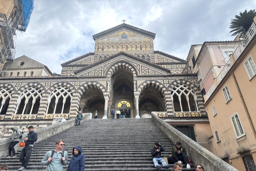 ソレント半島を横切り、ポジターノ方面へ向かうと、アマルフィを中心とする約40キロメートルの世界遺産登録エリアに入ります。紺碧の海、石灰岩質の入り組んだ入江、岩肌の段々畑に植えられたオリーブやレモン、オレンジなどの柑橘類を眺めながらアマルフィへ向かいました。ポジターノ、プライアーノ、コンカ・ディ・マリーニといった美しい海岸沿いの町々を通り抜ける、まさに絶景のドライブコースです。