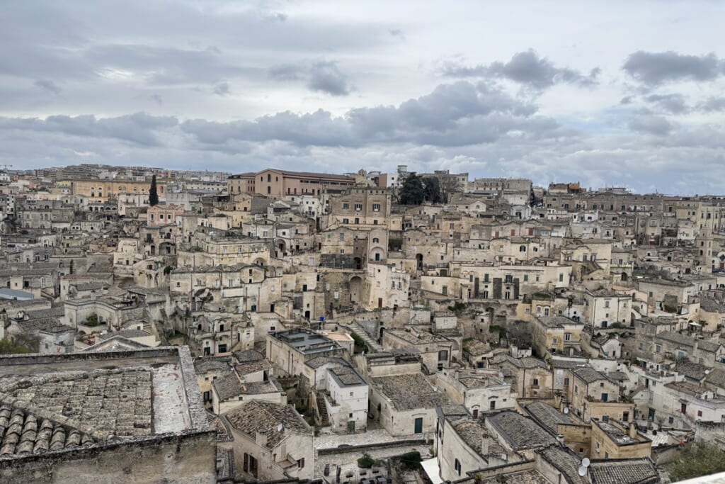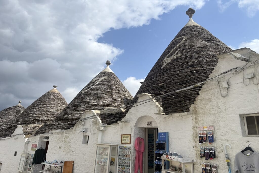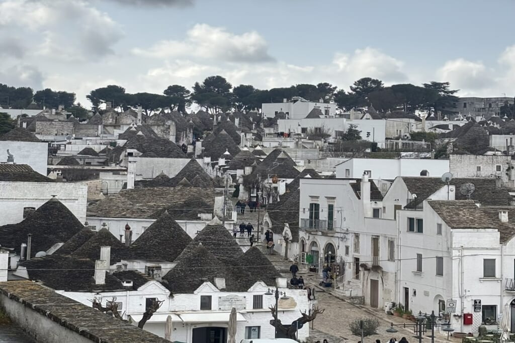 「イタリアの美しい村」に加盟する小さな町をはじめ、南イタリアならではの個性的な集落をいくつも訪れました。洞窟住居で知られるマテーラでは、石灰岩の斜面を掘り込んで造られた約7,000年前からの歴史を持つ洞窟住居群サッシ地区へ。13世紀創建の大聖堂から迷路のような路地を下り、かつて家族が暮らした洞窟住居の内部も見学しました。アルベロベッロでは、とんがり屋根のトゥルッリが約1000棟並ぶリオーネ・モンティ地区を歩きました。封建領主の税金対策として「屋根はすぐ壊せるように」と定められていた歴史は興味深いものです。また、チステルニーノ、モラーノ・カラブロ、サヴォカといった「イタリアの美しい村」にも足を延ばし、観光地化されていない素朴な町並みを楽しみました。サヴォカは映画「ゴッド・ファーザー」のロケ地としても知られています。