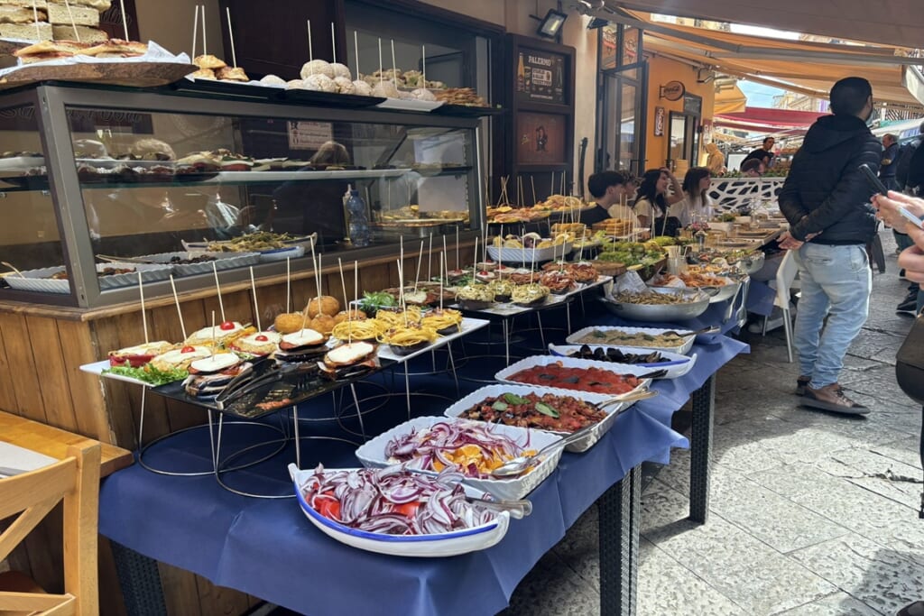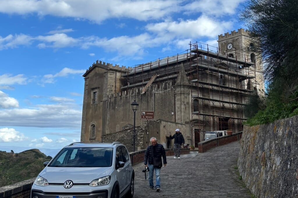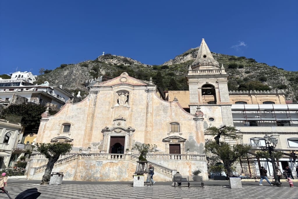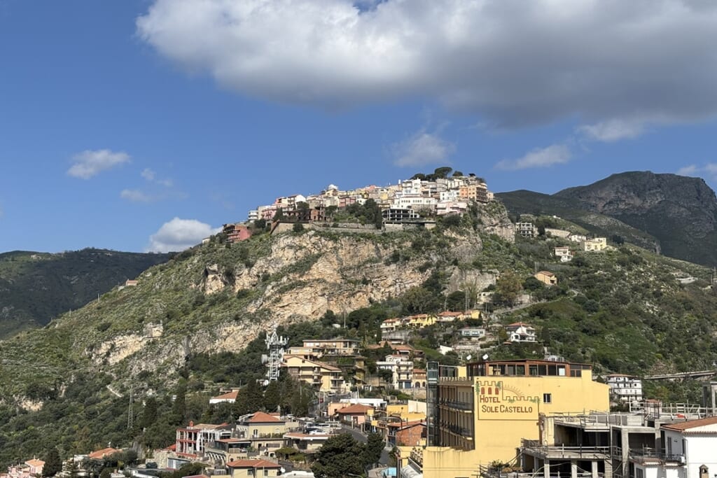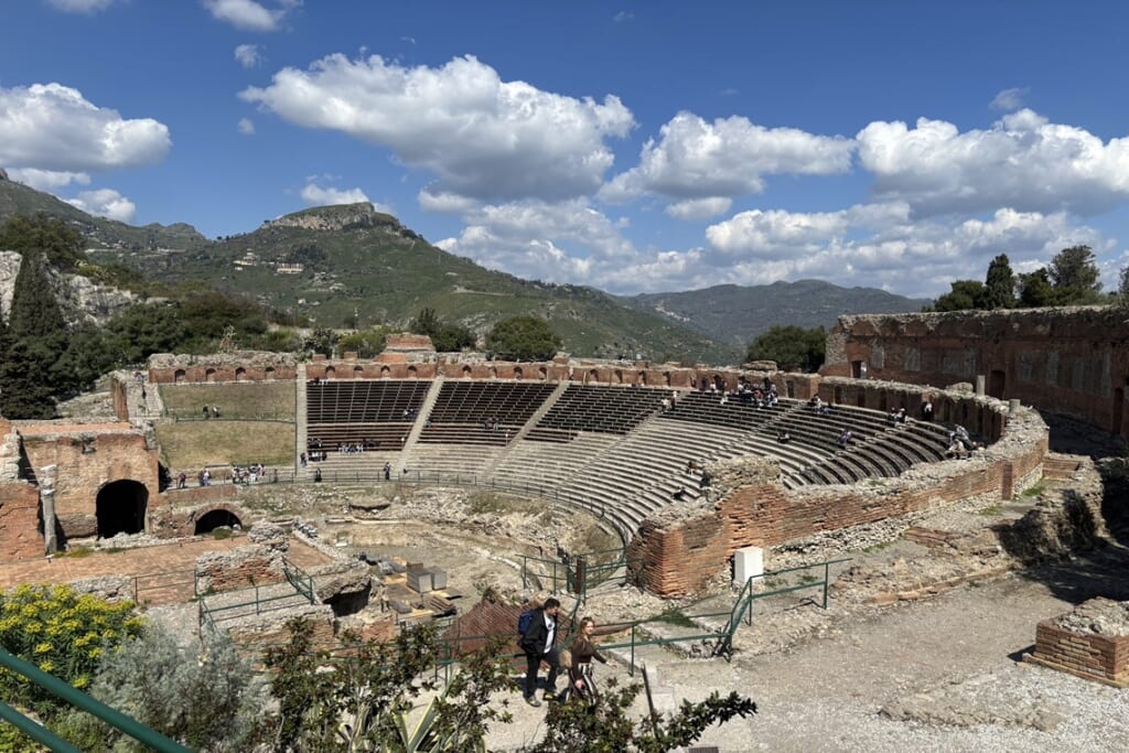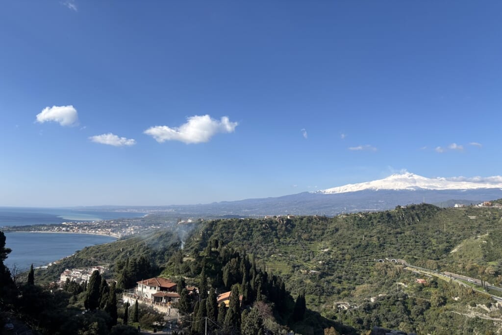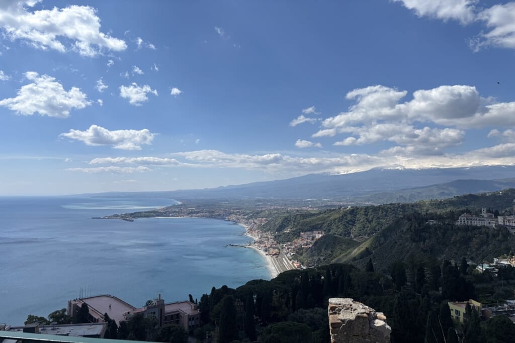 島の東海岸に位置するタオルミナでは、紀元前3世紀に建設されたギリシャ劇場へ。客席からはエトナ山とイオニア海を一望でき、現在も夏にはコンサートが開催されています。旧市街の散策や、丘の上の村カステルモーラからの眺望も見事でした。