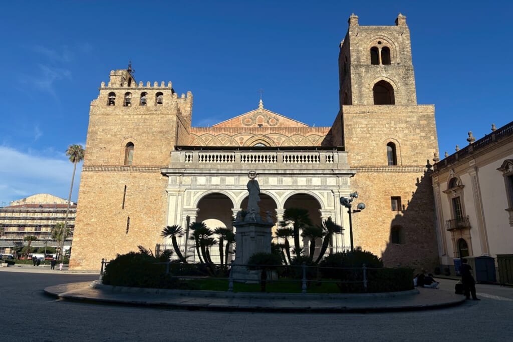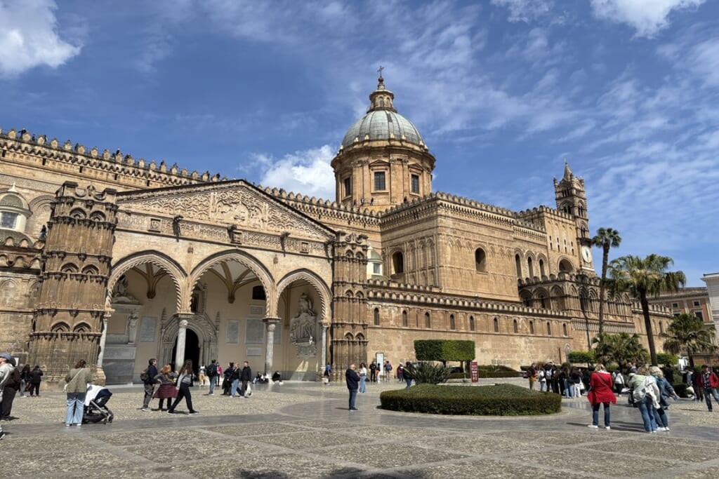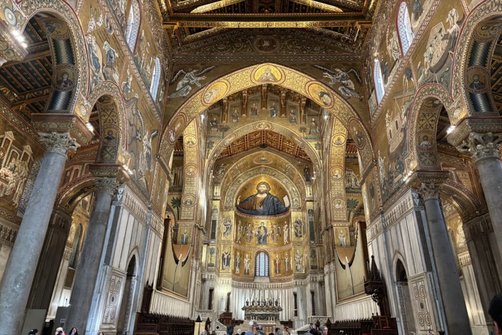シチリア島の州都パレルモでは、アラブ・ノルマン様式の建築群を巡りました。パレルモ大聖堂は12世紀に創建され、アラブやゴシックなど時代ごとの建築様式が重なり合う独特の外観が印象的です。パレルモ郊外のモンレアーレにある大聖堂は、外観こそ武骨ですが、中に入ると壁一面を黄金で精緻なモザイクと「ムカルナス」と呼ばれる鍾乳洞のような天井装飾が広がっており、その壮麗さに圧倒されました。