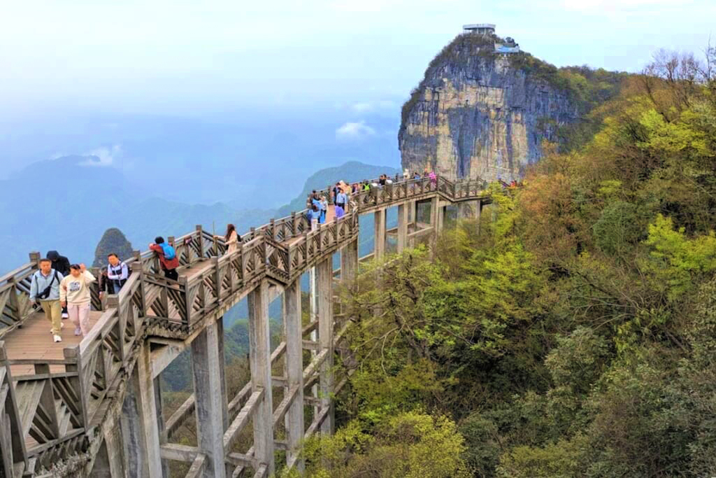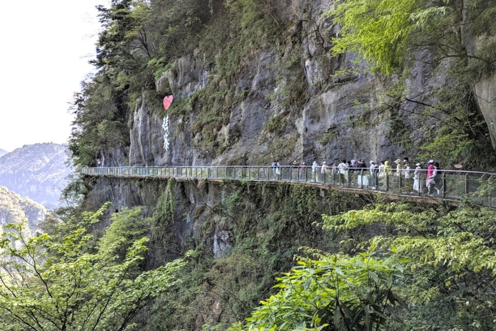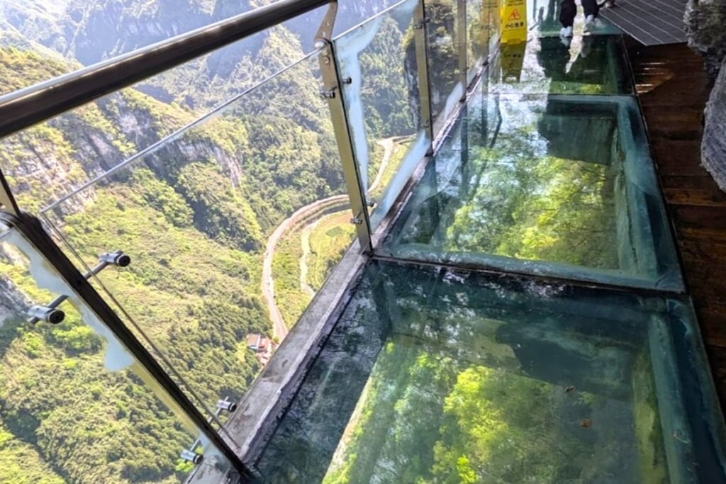 武陵源から鳳凰古城へ向かう道中、思わず息を呑む光景が待っていました。深い峡谷をひと跨ぎにする矮寨(わいざい)大橋です。谷底からの高さは約355m、主径間は1,176mにおよび、建設当時は山間部の吊り橋として世界最長クラスの規模を誇りました。さらに切り立った崖に造られた空中散歩道「懸崖桟道」からは、雄大なカルスト台地を見渡せます。桟道の一部はガラス張りでスリル満点でした。
