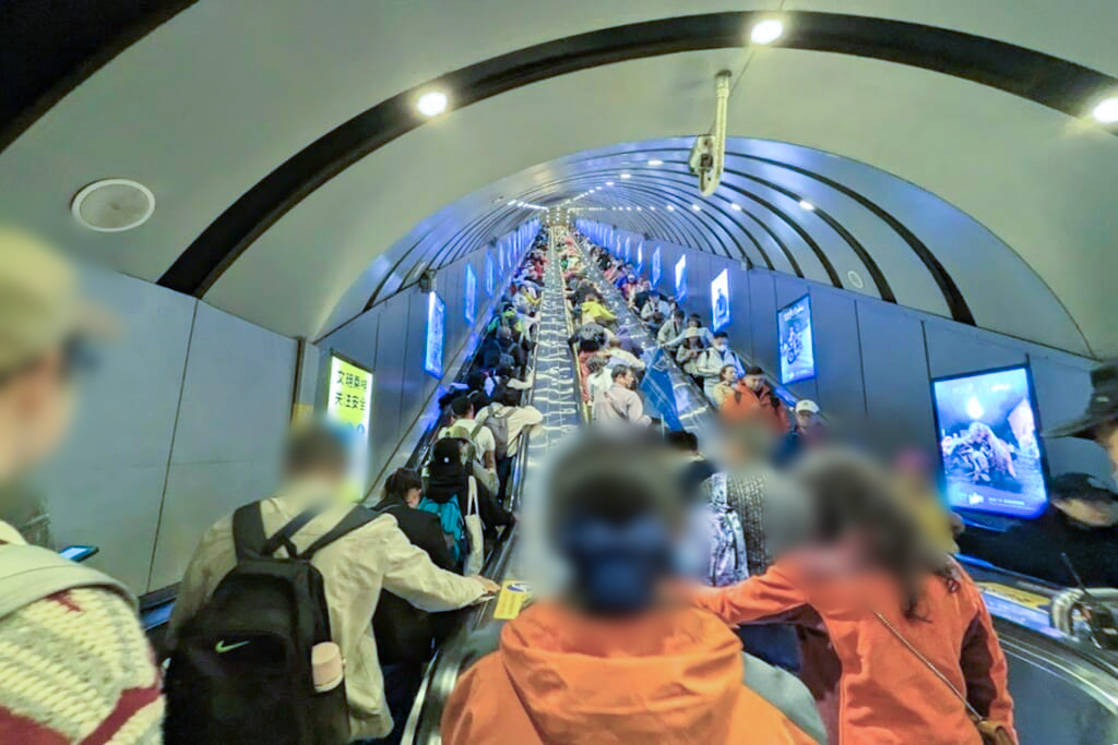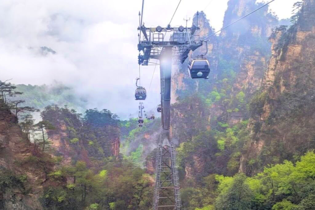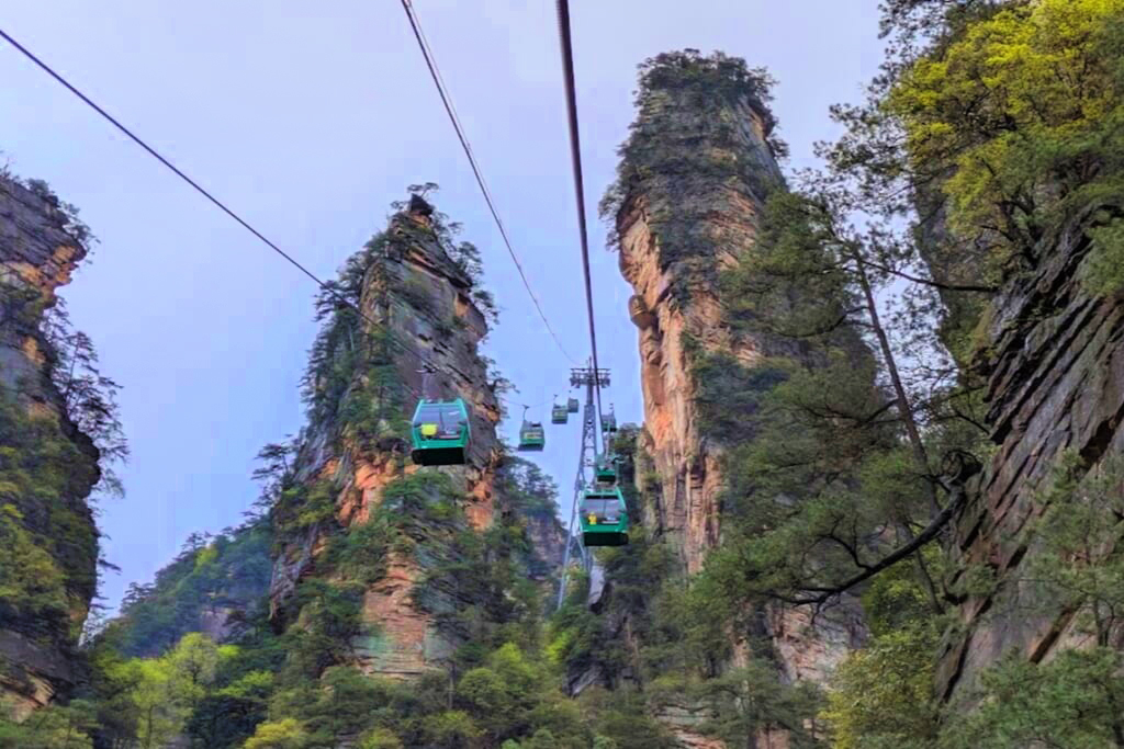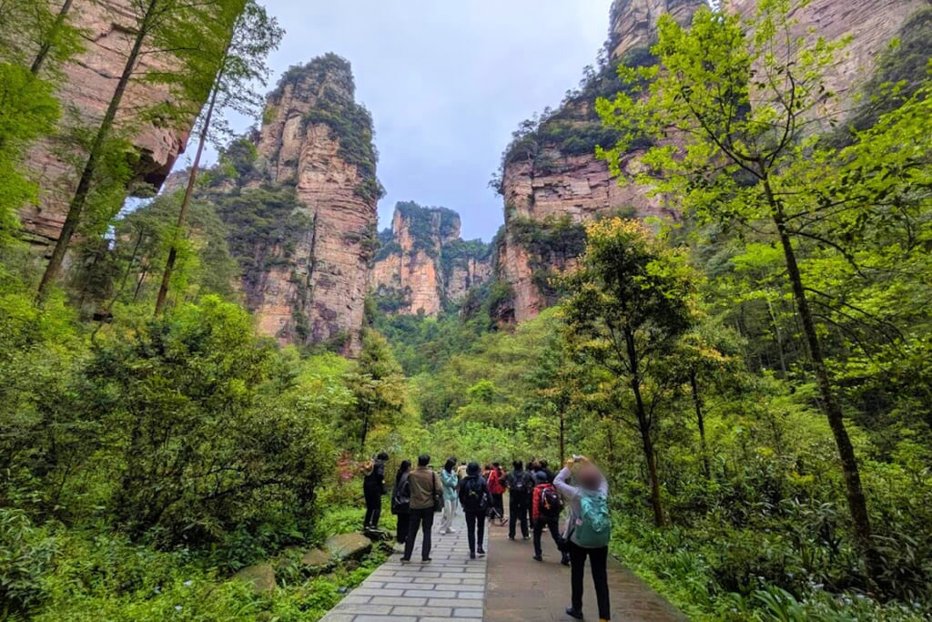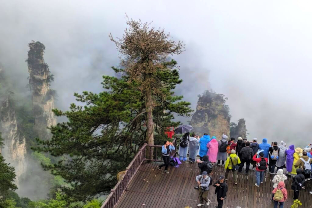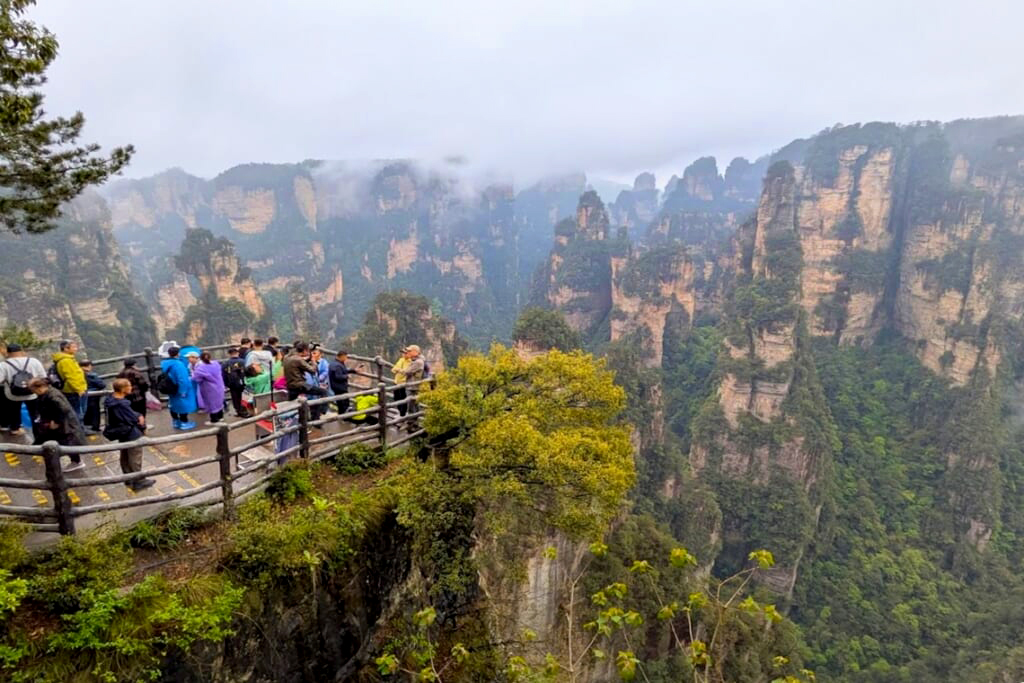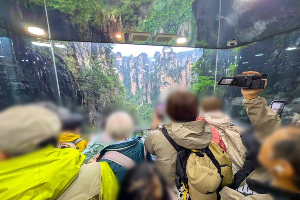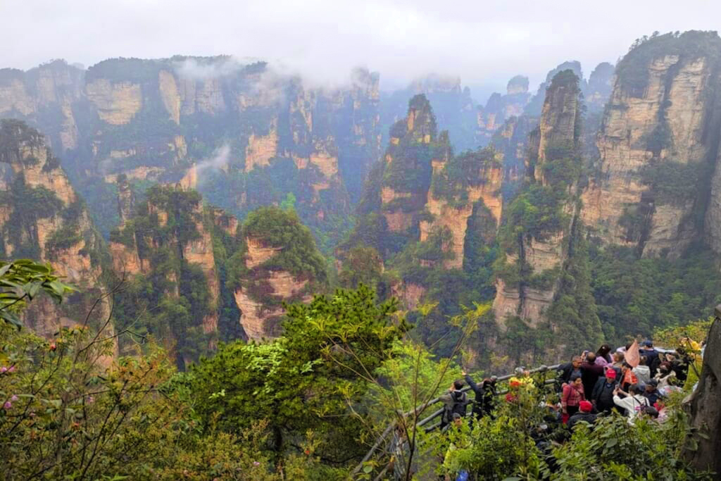 観光初日は、武陵源風景区の天子山と袁家界を巡りました。朝はあいにくの雨で霧に包まれていましたが、しばらくすると霧が少しずつ晴れ始め、その合間から林立する奇岩群が姿を現しました。霧の中に浮かび上がる峰々はまさに山水画の世界そのもの。風景区内の移動は一般の乗り合いバスではなく専用の貸し切りバスでスムーズに進み、百龍エレベーターも待つことなく優先的に乗ることができました。