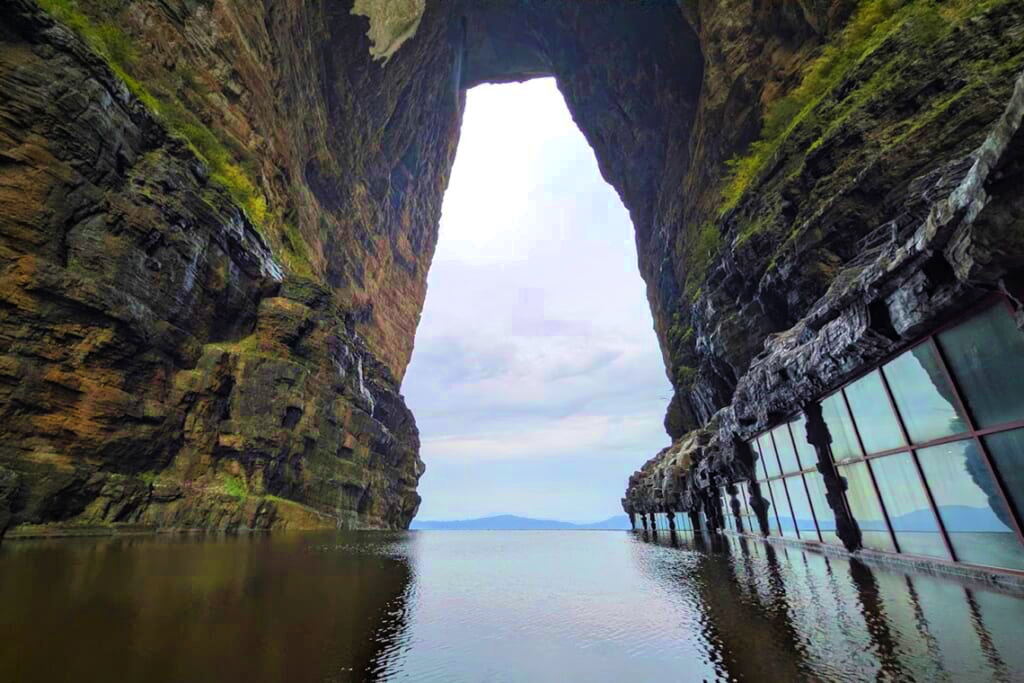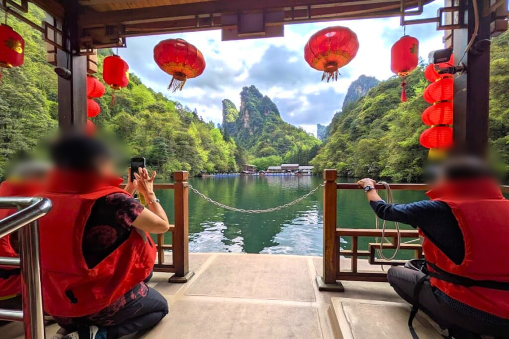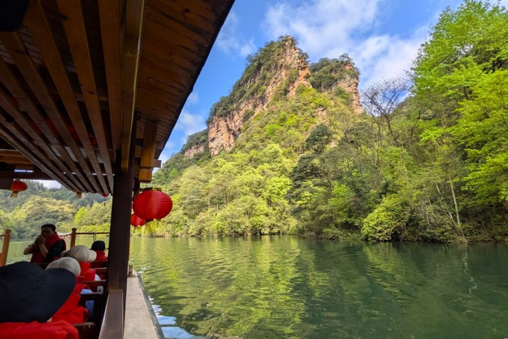 午後になると雨雲が去り、待望の青空が広がりました。気温も上がり、絶好の遊覧日和です。向かったのは、切り立った岩峰に囲まれた神秘的な湖・宝峰湖。エメラルドグリーンの湖面を遊覧船でのんびりと巡りました。湖上では、この地域に暮らす少数民族トゥチャ族(土家族)の方が美しい民謡を披露してくださり、船から眺める絶景とともに、心に残るひとときとなりました。