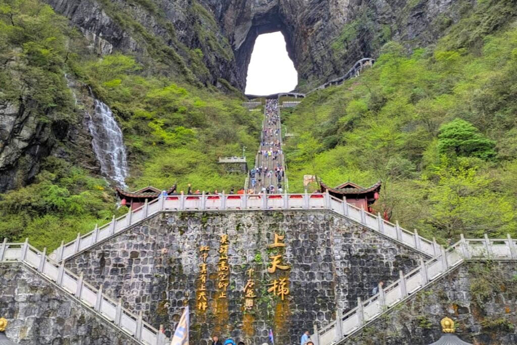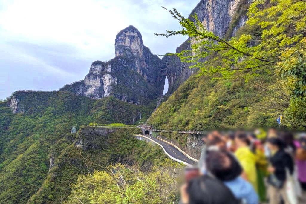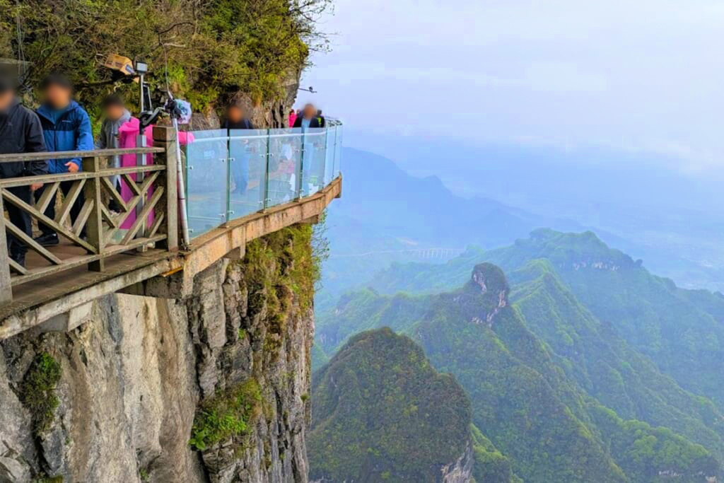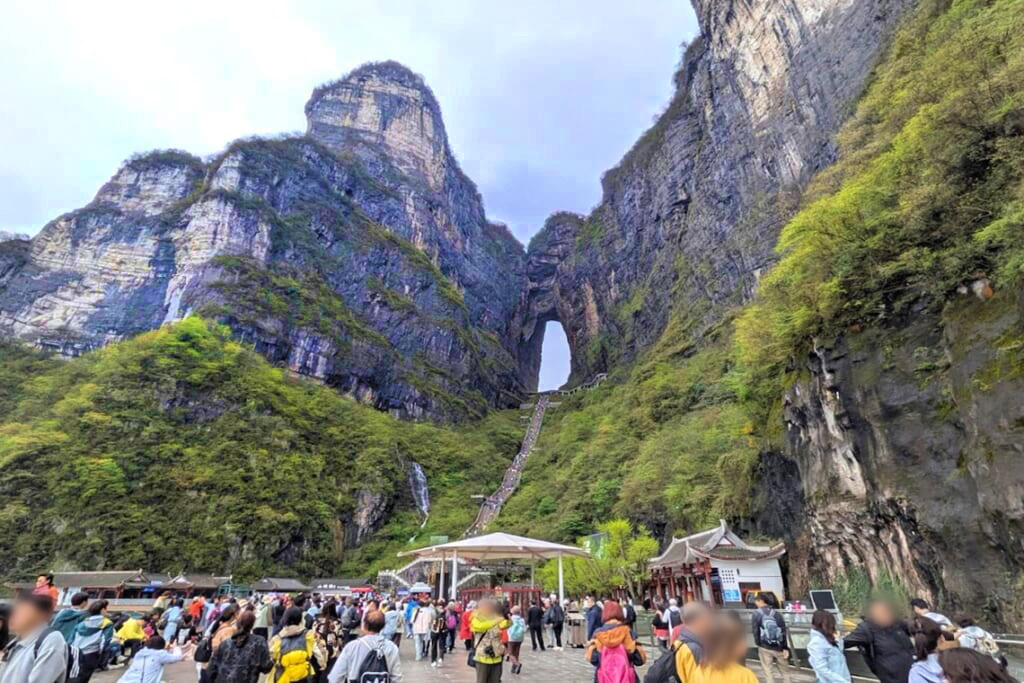 ロープウェイで山上駅に到着すると、切り立った断崖の縁に沿って絶景の遊歩道が続きます。天門山のシンボルである天門洞、高さ約130mの巨大な天然アーチも大迫力で、自然の壮大さを実感させてくれました。