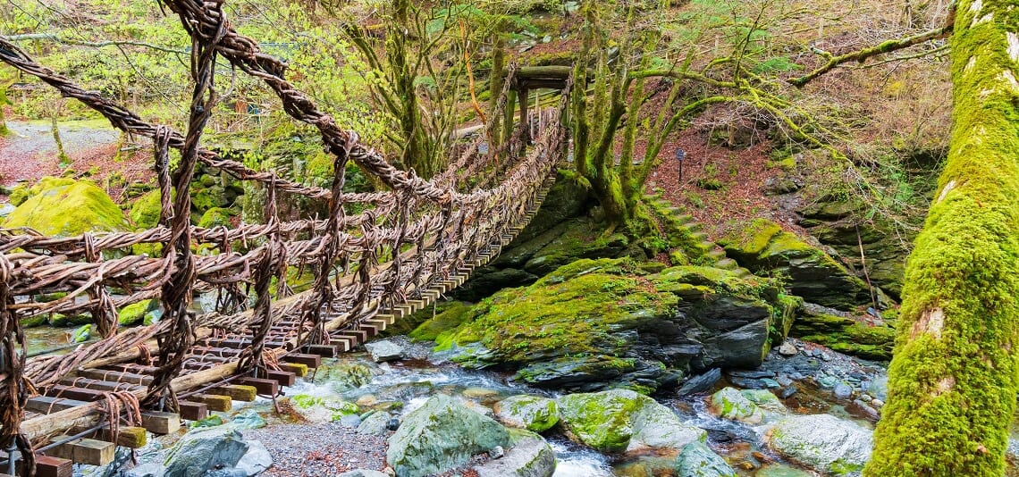 熊本県八代市の山間部に位置する「五家荘(ごかのしょう)」。ここも平家の落ち武者が逃れて来たという伝説が残る秘境です。九州中央山地の奥地にあたり標高1,300~1,700m級の山が連なり、こんな場所に人が暮らしているのか?と思うような、まさに秘境の中の秘境です。人里離れたこの地は、平家の子孫や菅原道真の子が逃れてきた隠れ里であるといわれています。椎原(しいばる)、久連子(くれこ)、葉木(はぎ)の3地区には平家の子孫が、そして仁田尾(にたお)、樅木(もみき)の2地区には菅原氏の子孫が住んだといわれ、合わせて5つの庄屋があったことが「五家荘」の名前の由来です。この山奥の暮らしには吊り橋が欠かせず、この大吊り橋が観光の目玉になっており、10月、11月の紅葉も見事です。